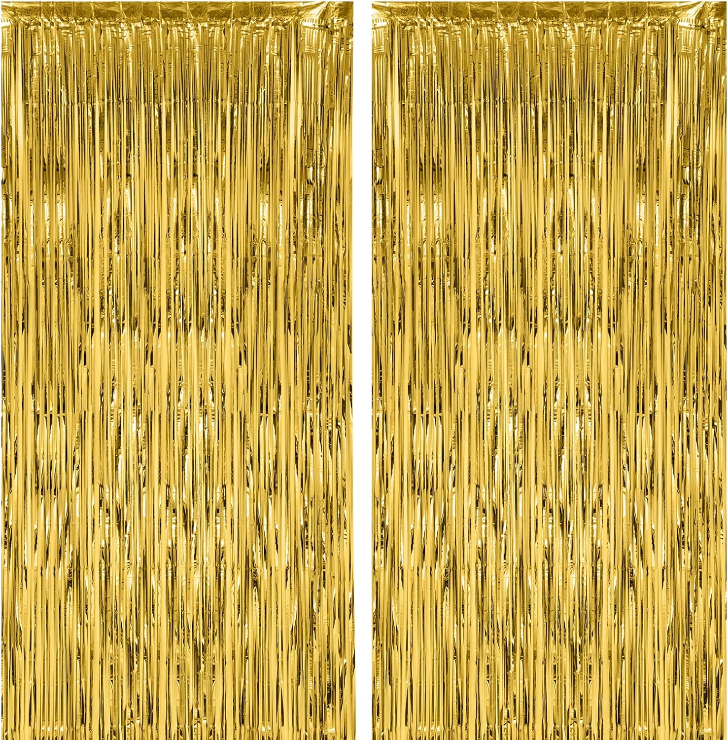 2 Pack Gold Foil Fringe Backdrop Curtains, Tinsel Streamers Birthday Party Decorations, Fringe Backdrop for Graduation, Baby Shower, Gender Reveal, Disco Party