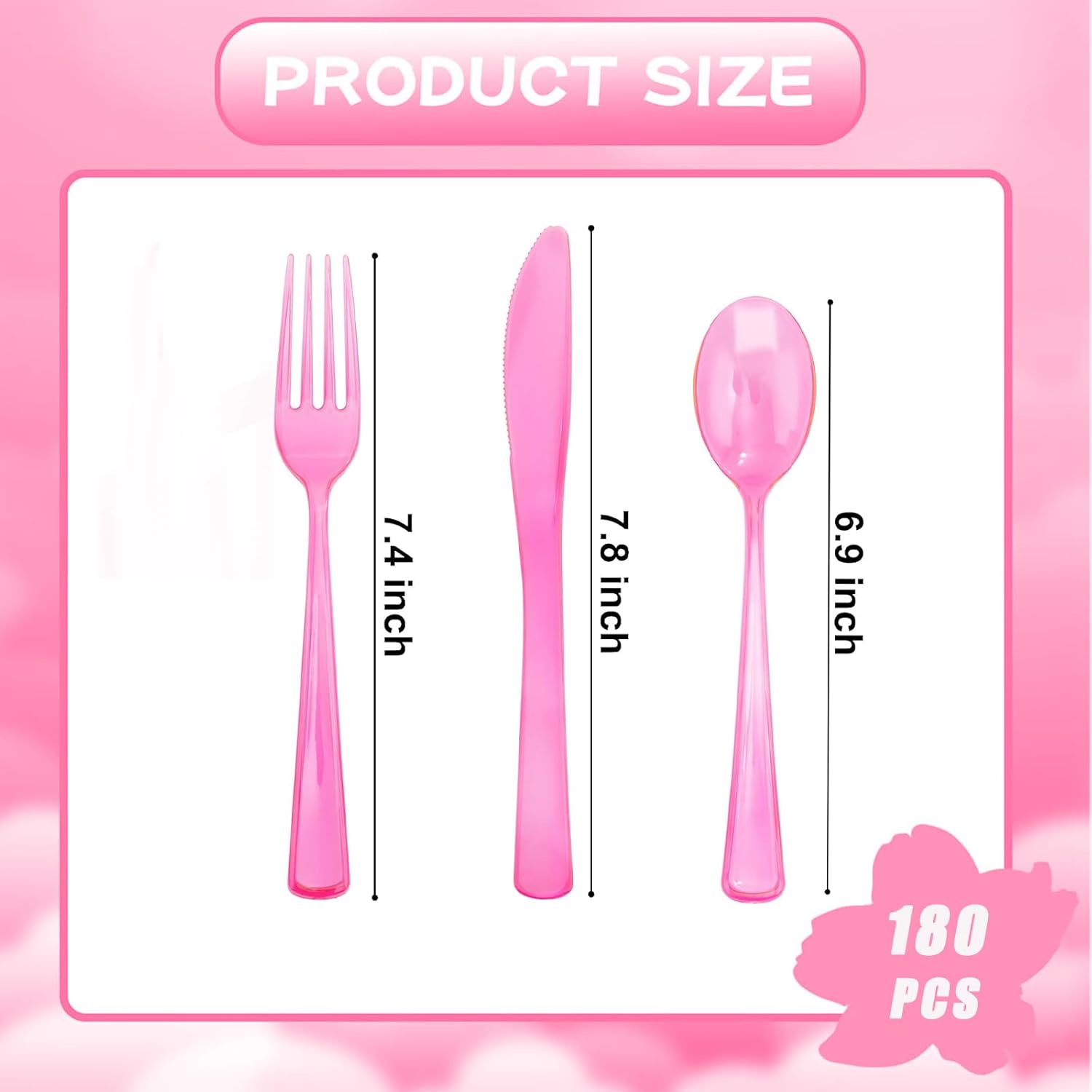 - PINK PLASTIC SILVERWARE SET: Combo pack includes 60 pink forks, 60 pink knives and 60 pink spoons. Keep a box in your pantry to use anytime you donβt have time to clean.