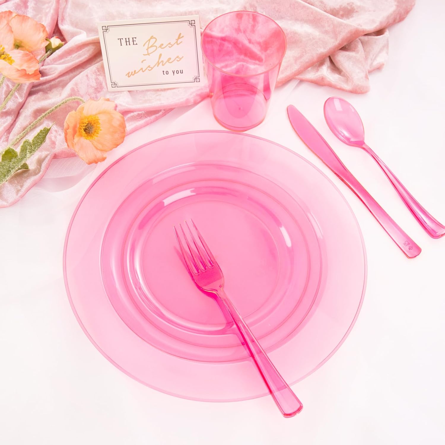 - SAFETY AND COMFORTABLE: Our pink cutlery plastic are plastic material, it can directly contact food. Make your family, friends comfortable and happy wonderful days!