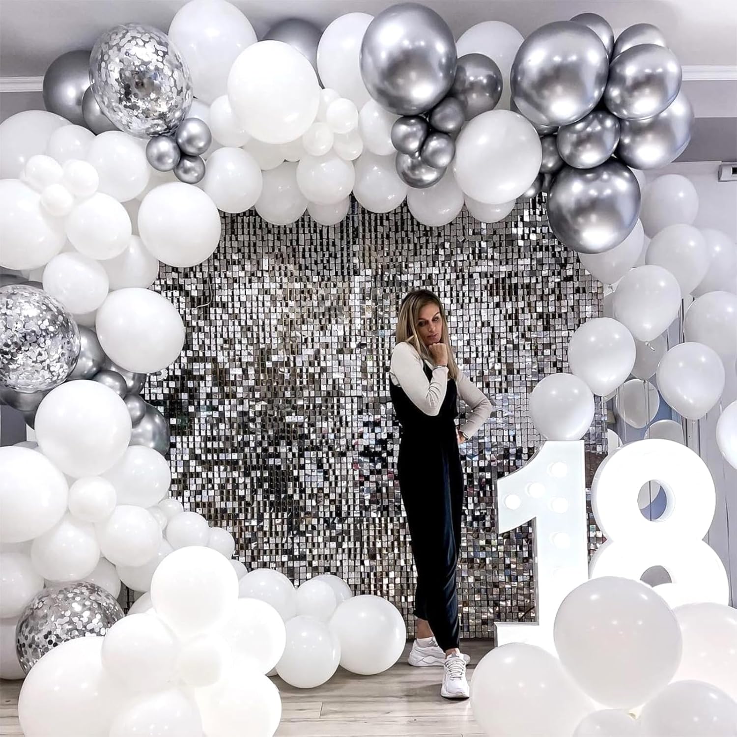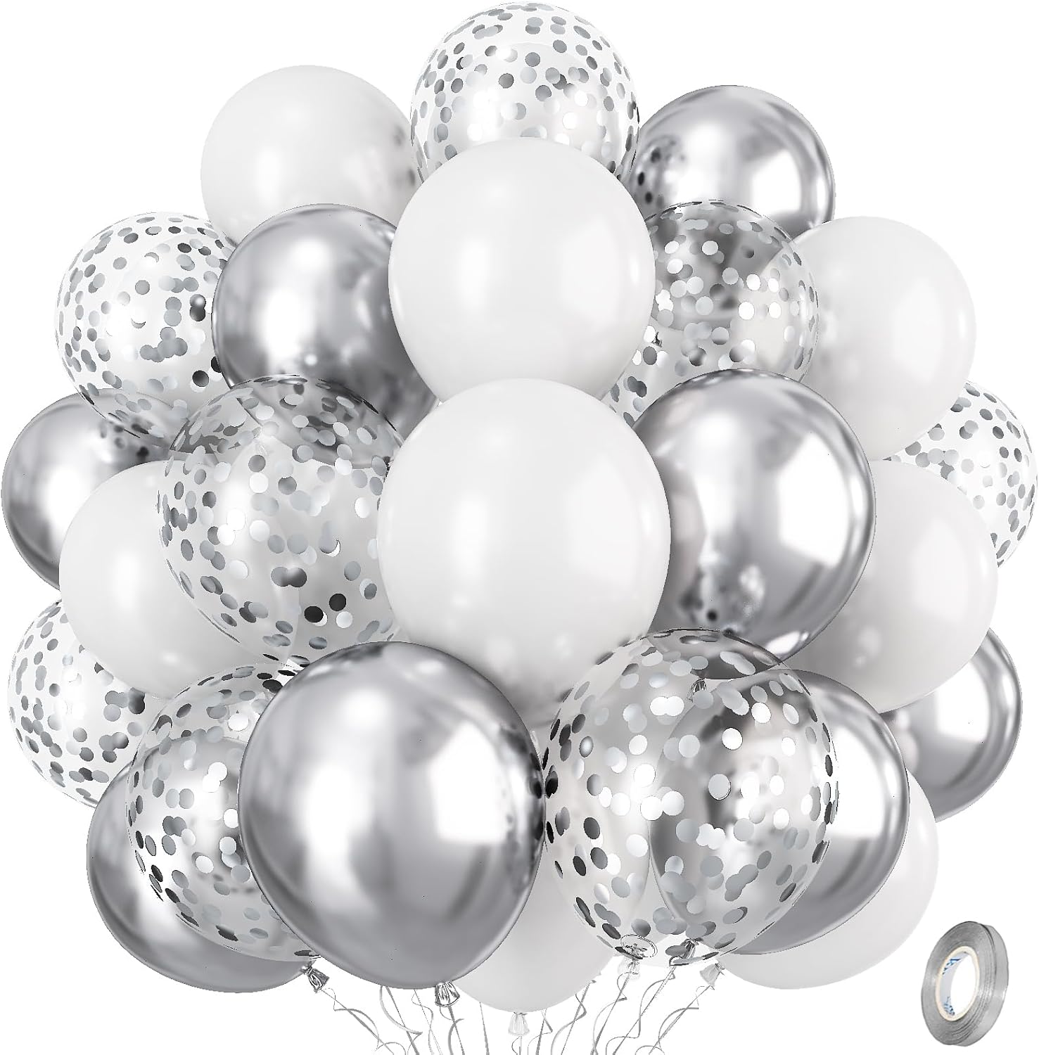 Silver and White Balloons, 12 Inch Metallic Silver White Latex Balloons Set Decor with Silver Confetti Helium Balloons for Boys Girls Birthday Party Baby Shower Wedding Graduation Party Decorations