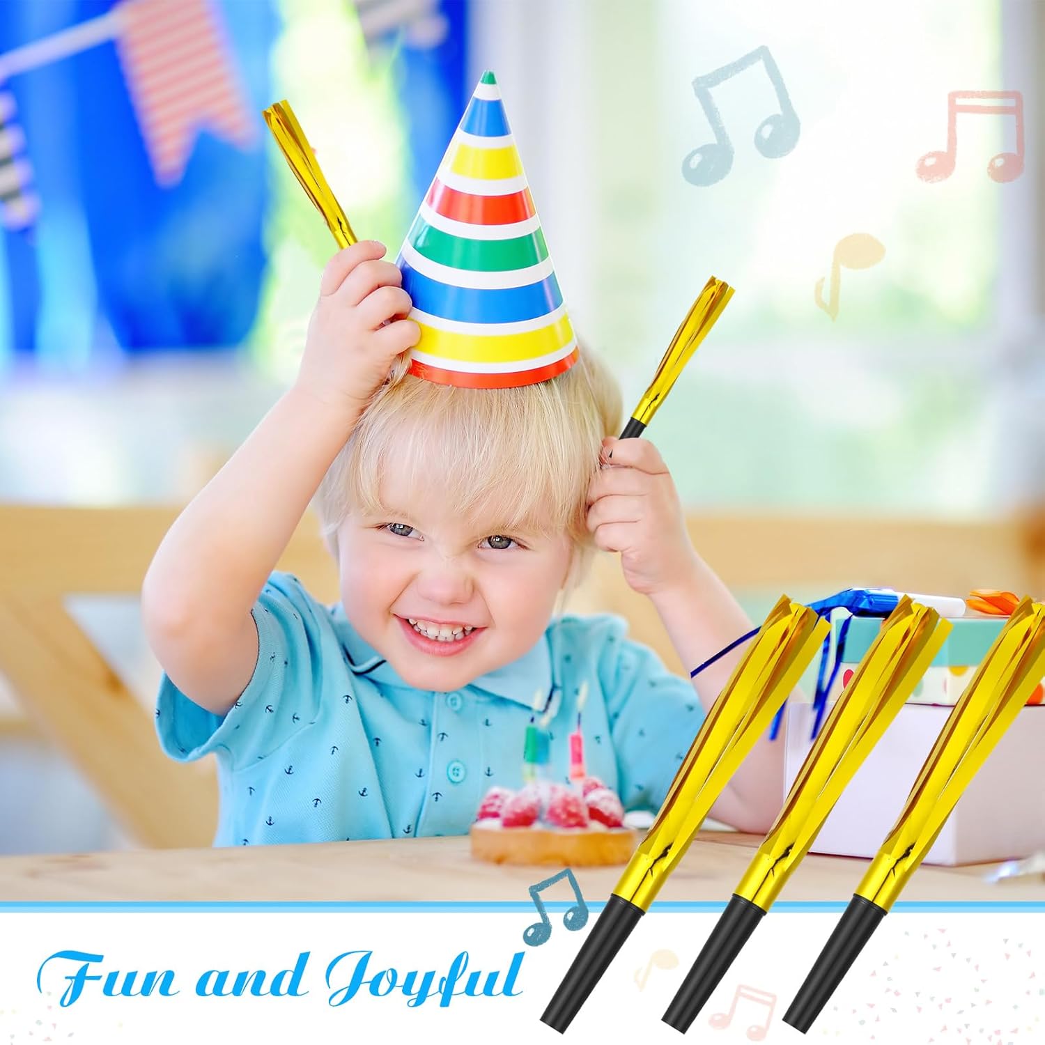 48 Pcs Gold Noise Makers Glitter Metallic Fringed Noise Makers Horns for Baby Shower, Kids Birthday, Wedding Party, New Year Party Favor