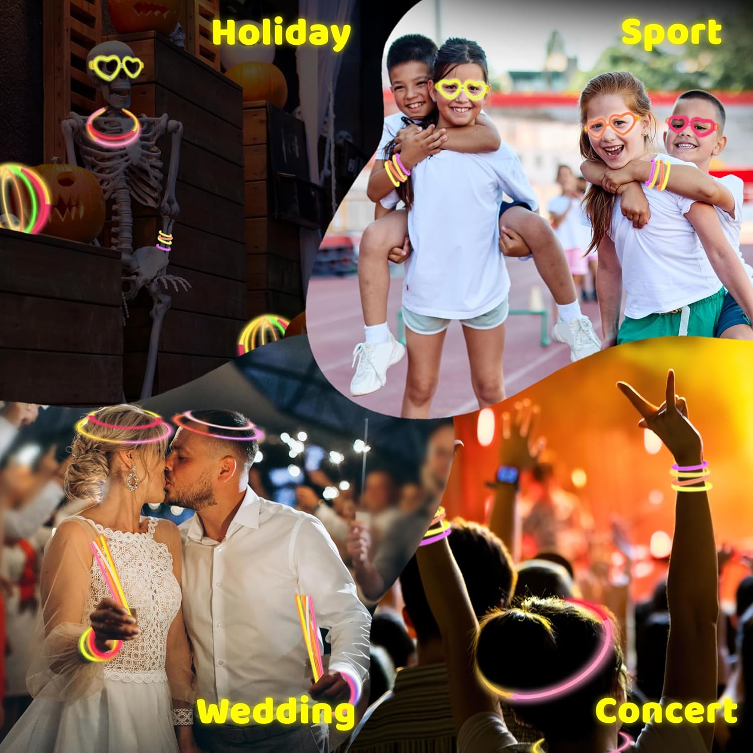 - AN ARRAY OF COLORS: Oh, those pics will be keepers! Youβll find everything from red, orange, pink, yellow, white, purple, to green glow sticks in this set. Each measures approximately 8β long to really stand out.