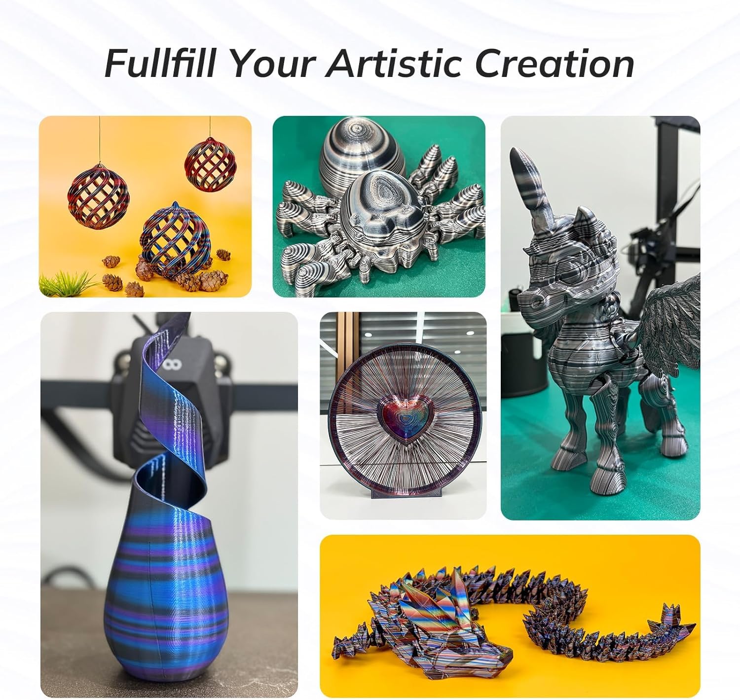 - Silk Multicolor Rainbow PLA: S-series is A line of multi-color spinning fast color change, spiral random color change bring your model more surprise effect. You can print beautiful multicolors in one PLA filament. Perfect for arts, crafts, DIY