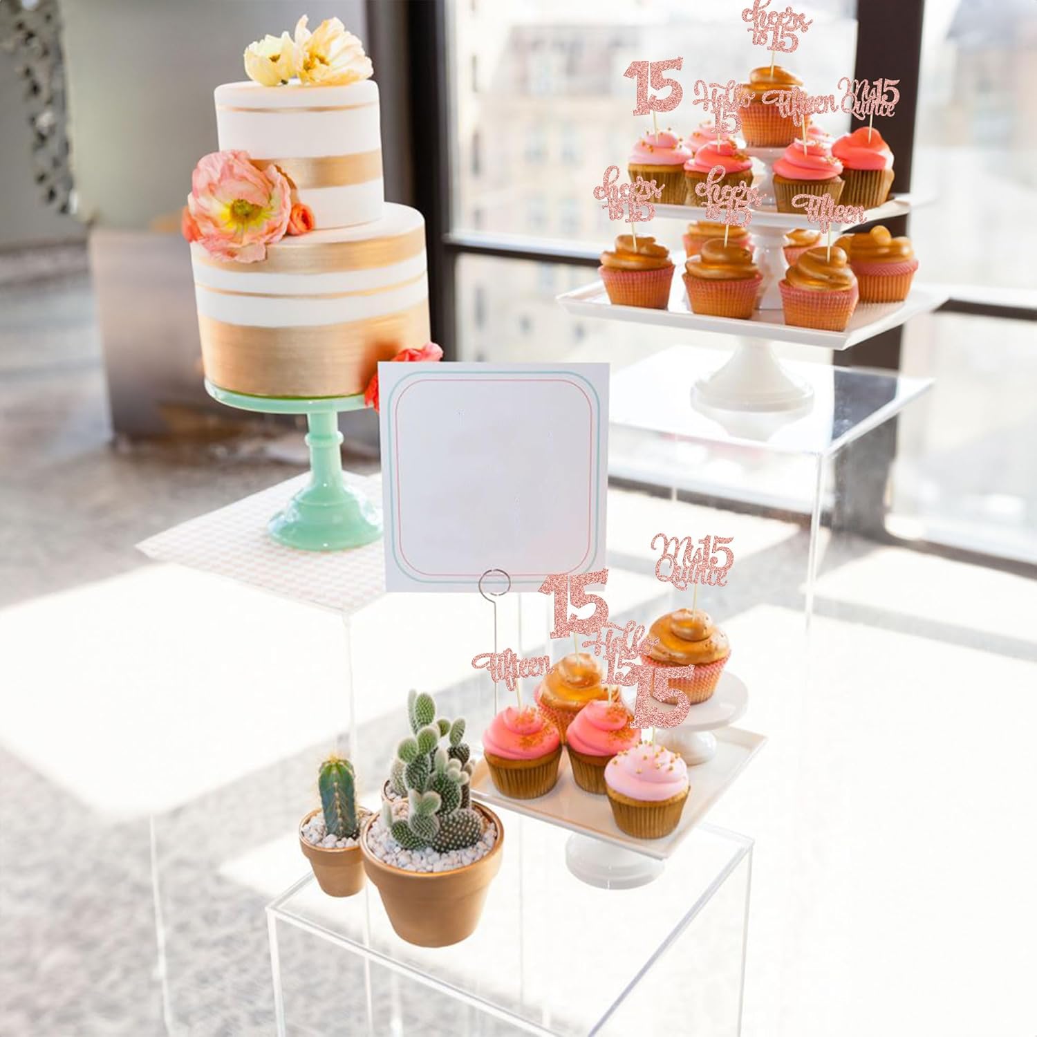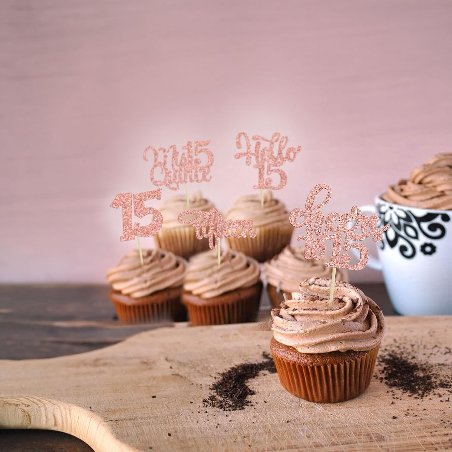 30Pcs 15th Birthday Cupcake Toppers Fifteen Cupcake Picks Cheers to 15 Years Old Mis Quince 15 Cake Decorations for 15th Birthday Anniversary Party Rose Gold Glitter