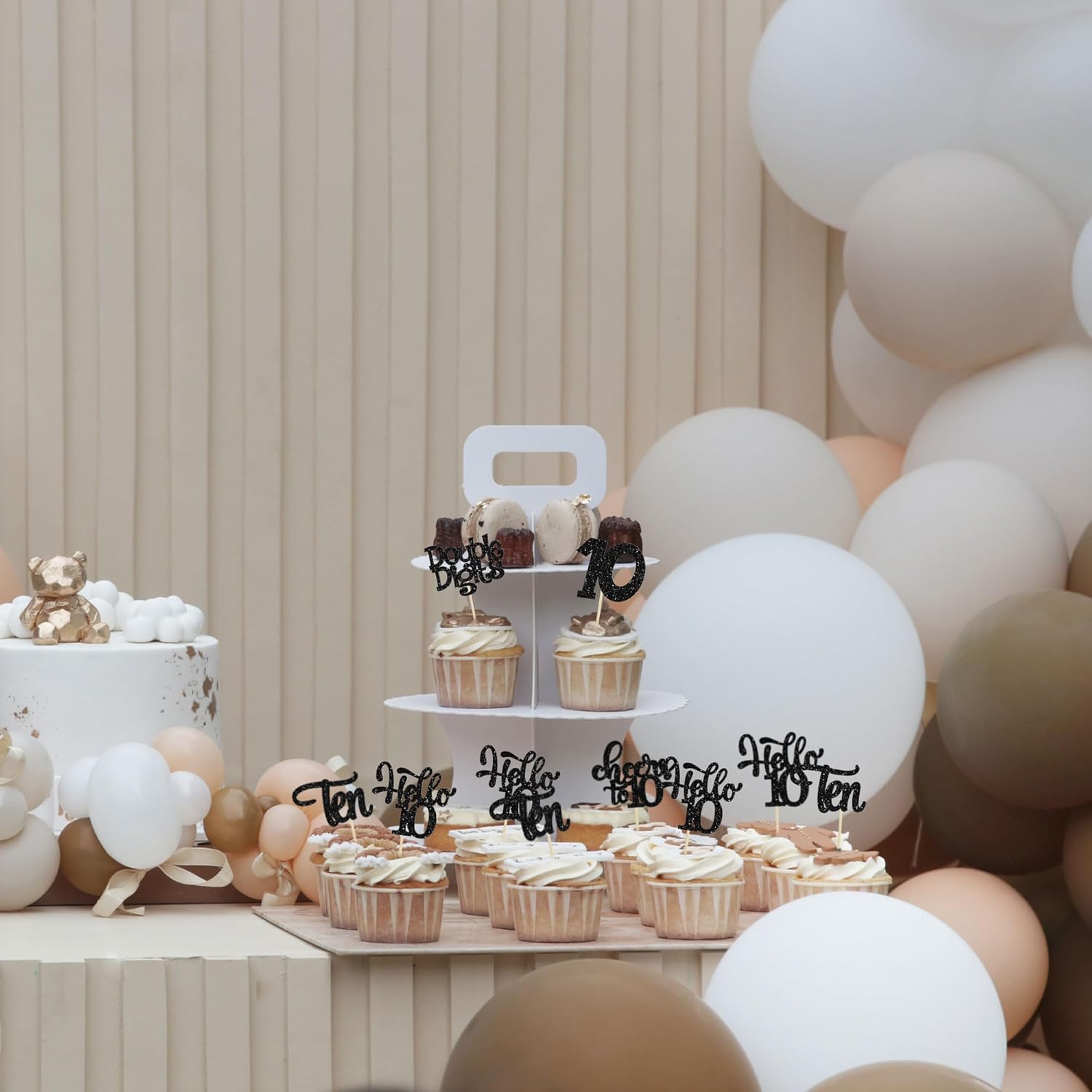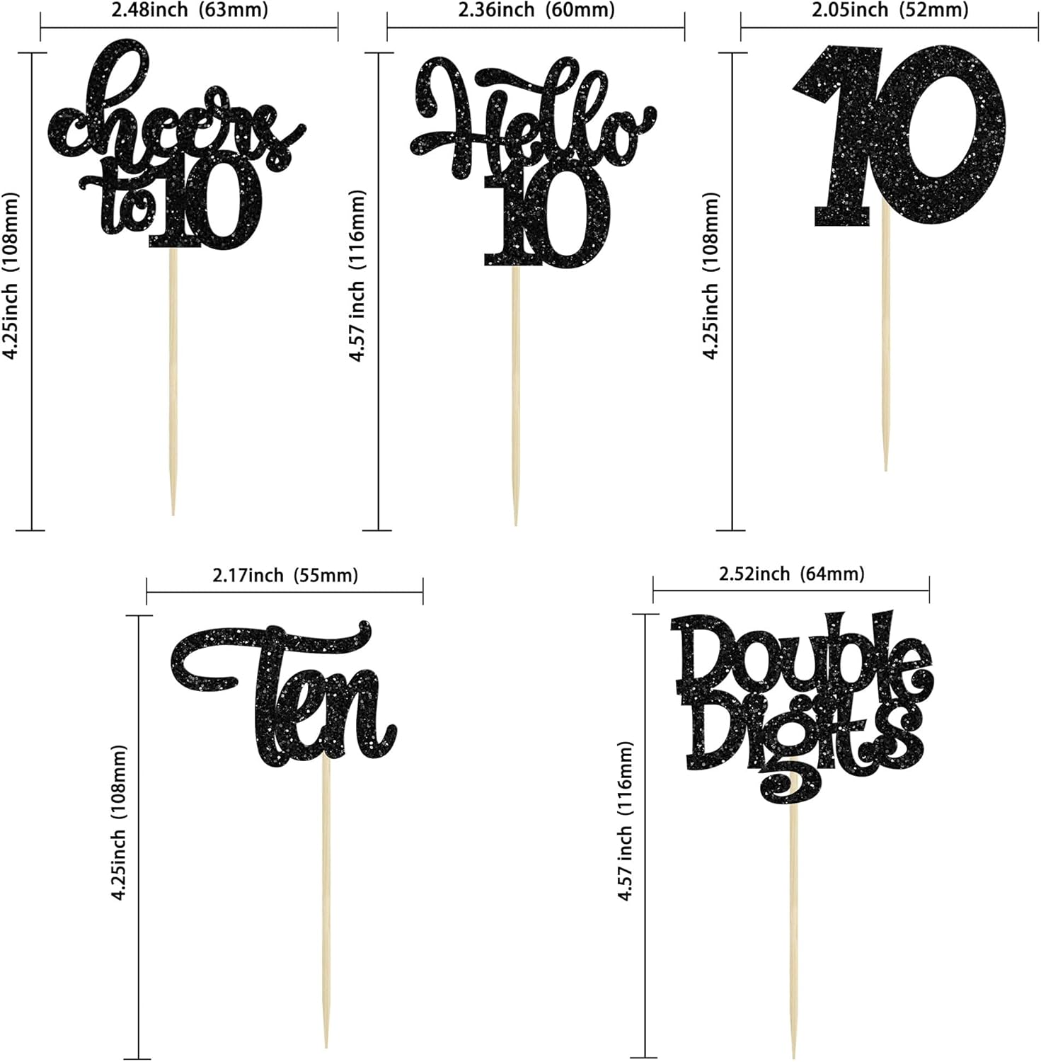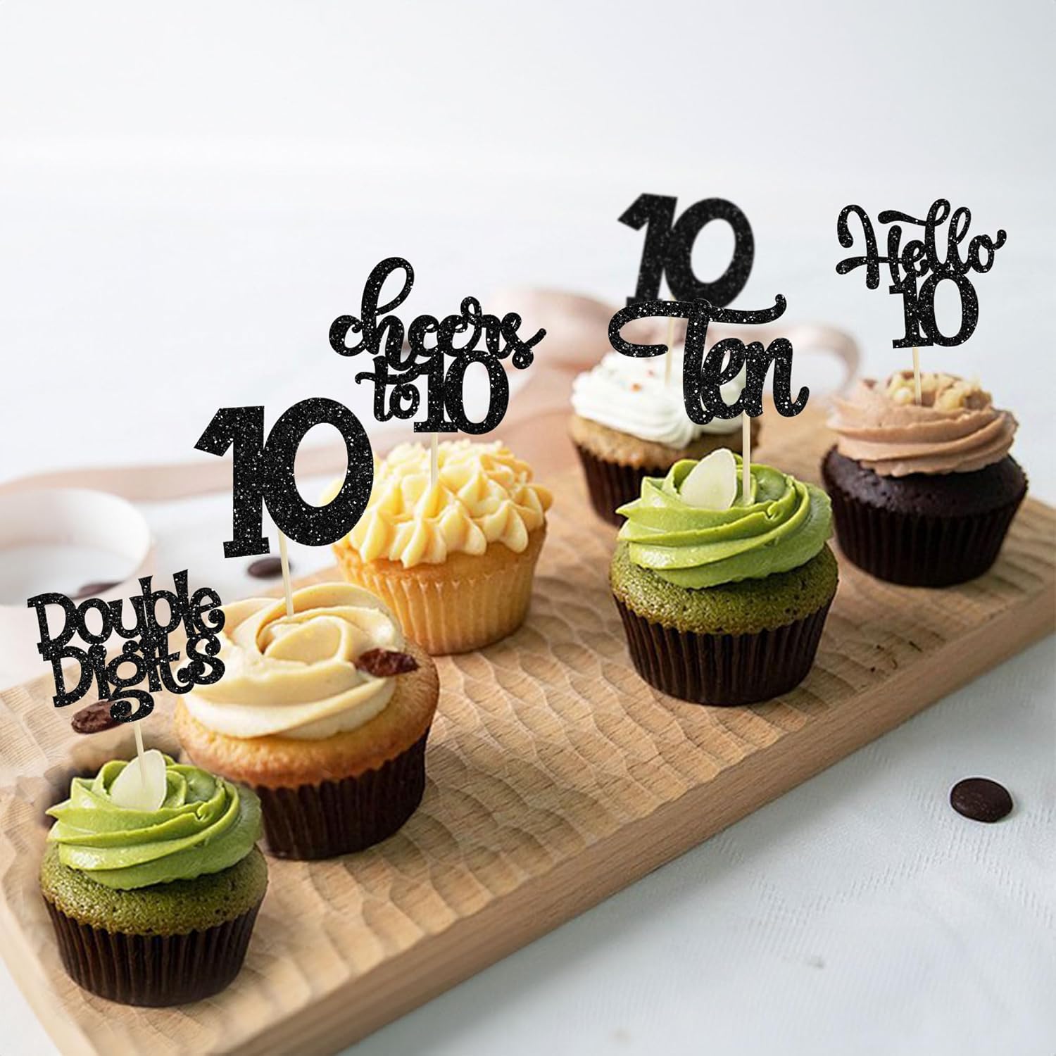 30Pcs 10th Birthday Cupcake Toppers Ten Double Hello 10 Cupcake Picks Cheers to 10 Years Old Cake Decorations for 10th Birthday Party Supplies Black Glitter
