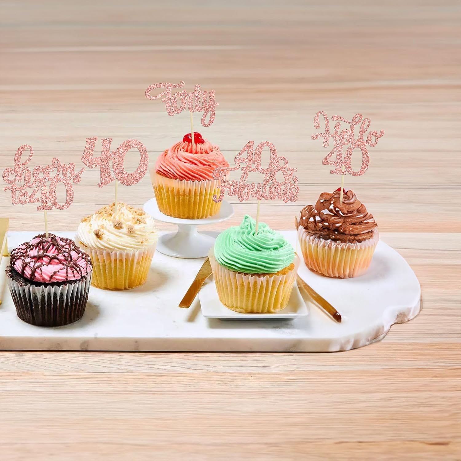 Gyufise 30Pcs Happy 40th Birthday Cupcake Toppers Rose Gold Glitter Forty Cheers to 40 Years Old Birthday Cupcake Picks for Happy 40th Birthday Anniversary Party Cake Decorations