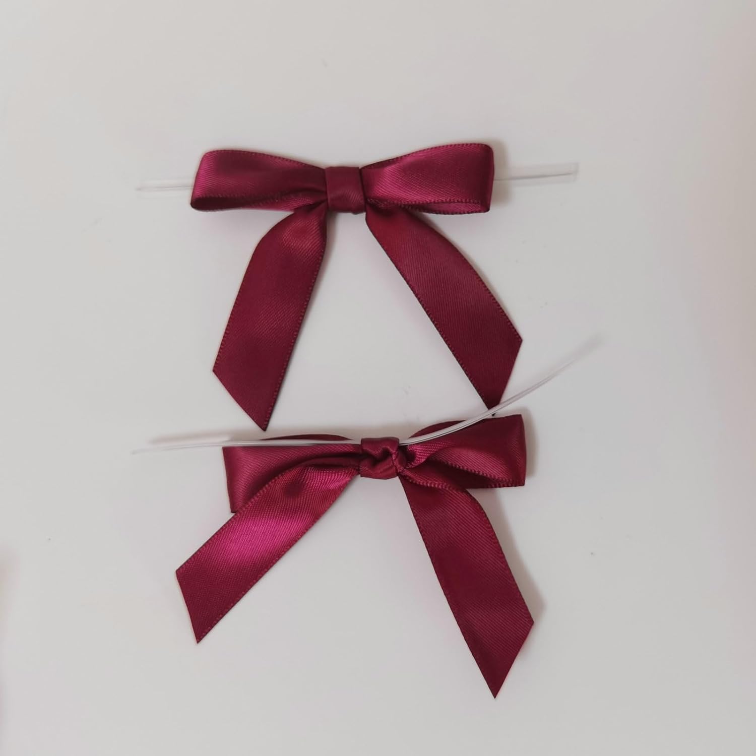 - Twist tie bows are made of burgundy satin ribbon and paired with twist ties which will attach them to bags or decorations.