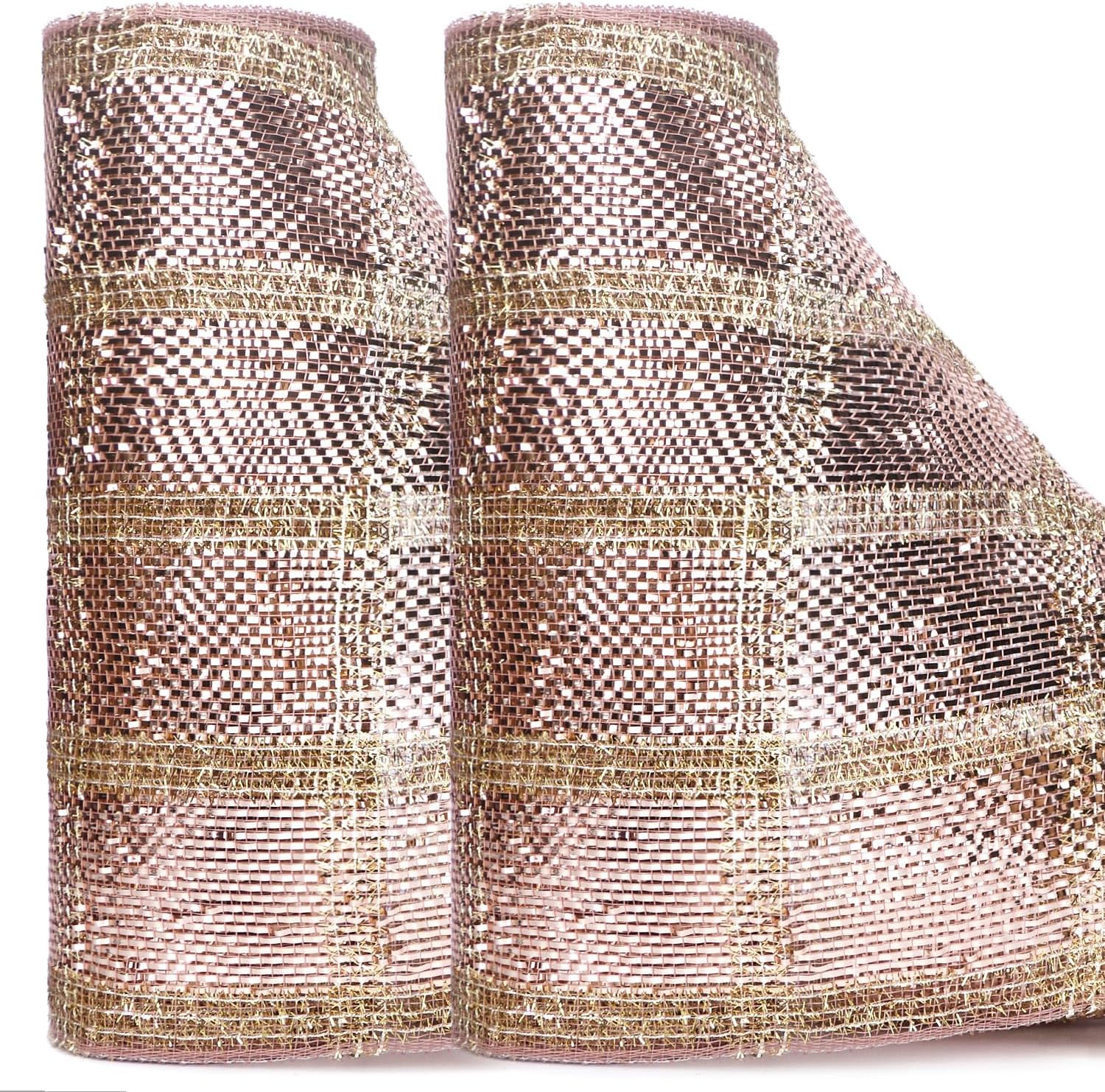 Ribbli 2 Rolls Rose Gold Metallic Mesh Ribbon Rose Gold Deluxe Foil and Glitter Strip Christmas Ribbon for Christmas Tree Wreath Swags Wedding Garland 10 inch x 30 feet(10Yard) Per Roll