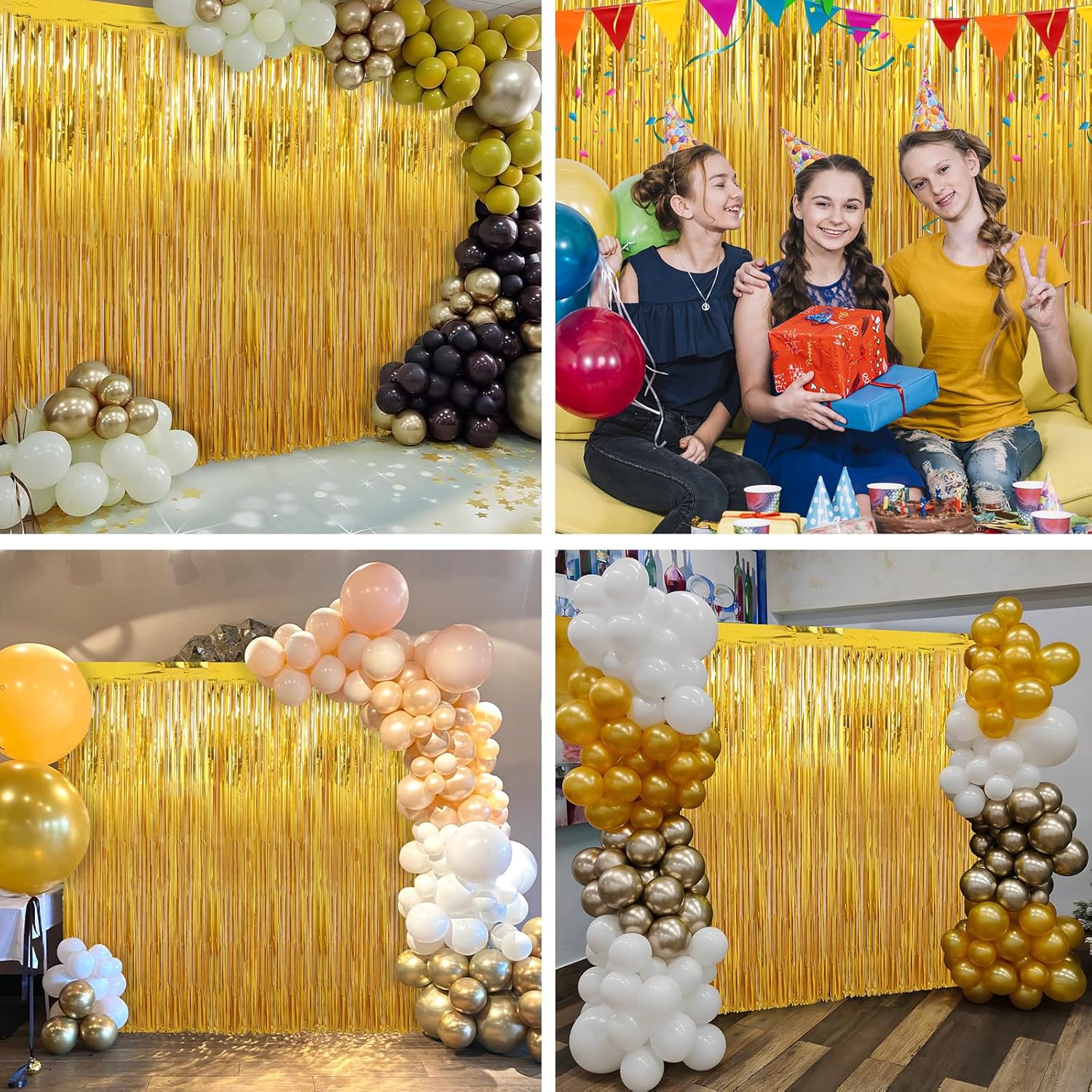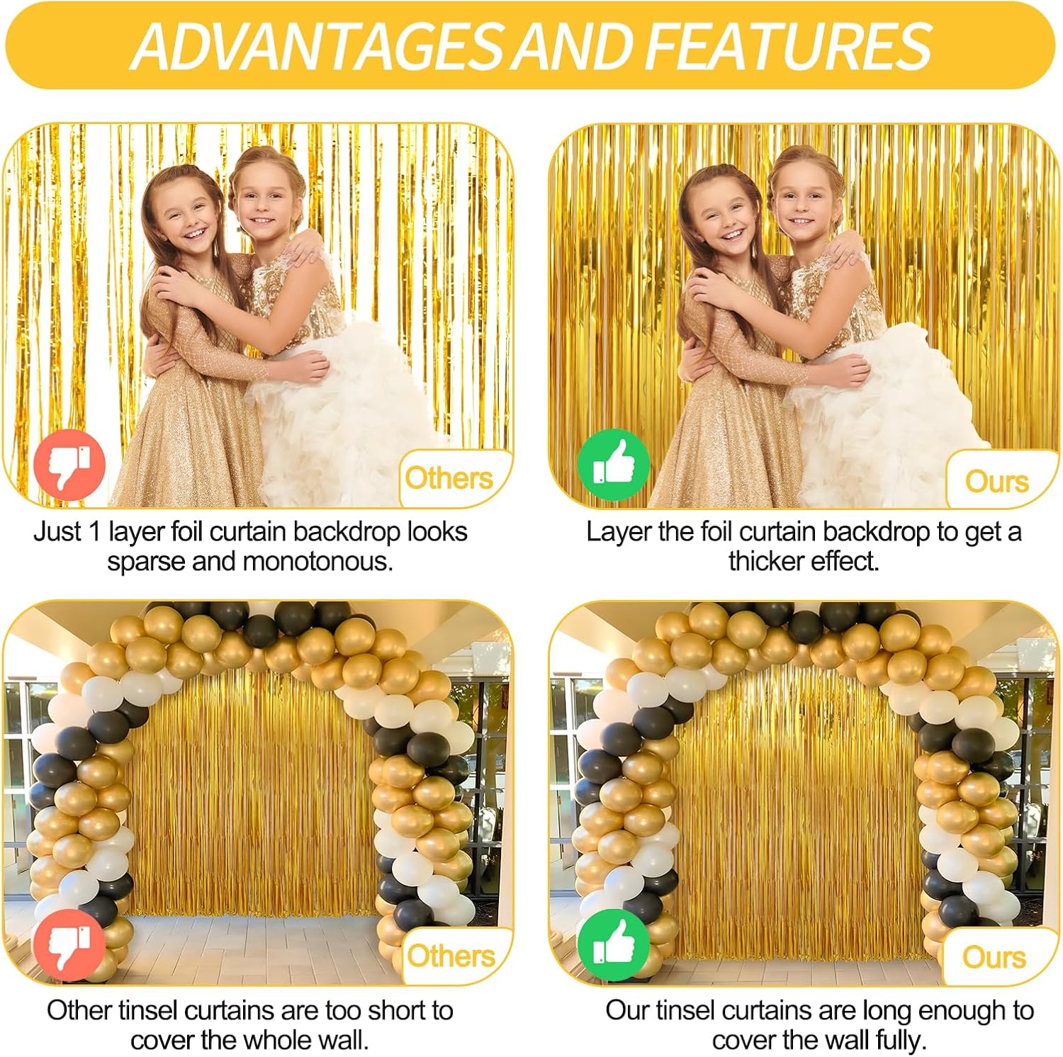 - Durable & Reusable - These party backdrop are made of durable tinsel with a shiny surface, which will keep the shimmer effect all the time, so they can be reused at another time, and light up your parties every time.