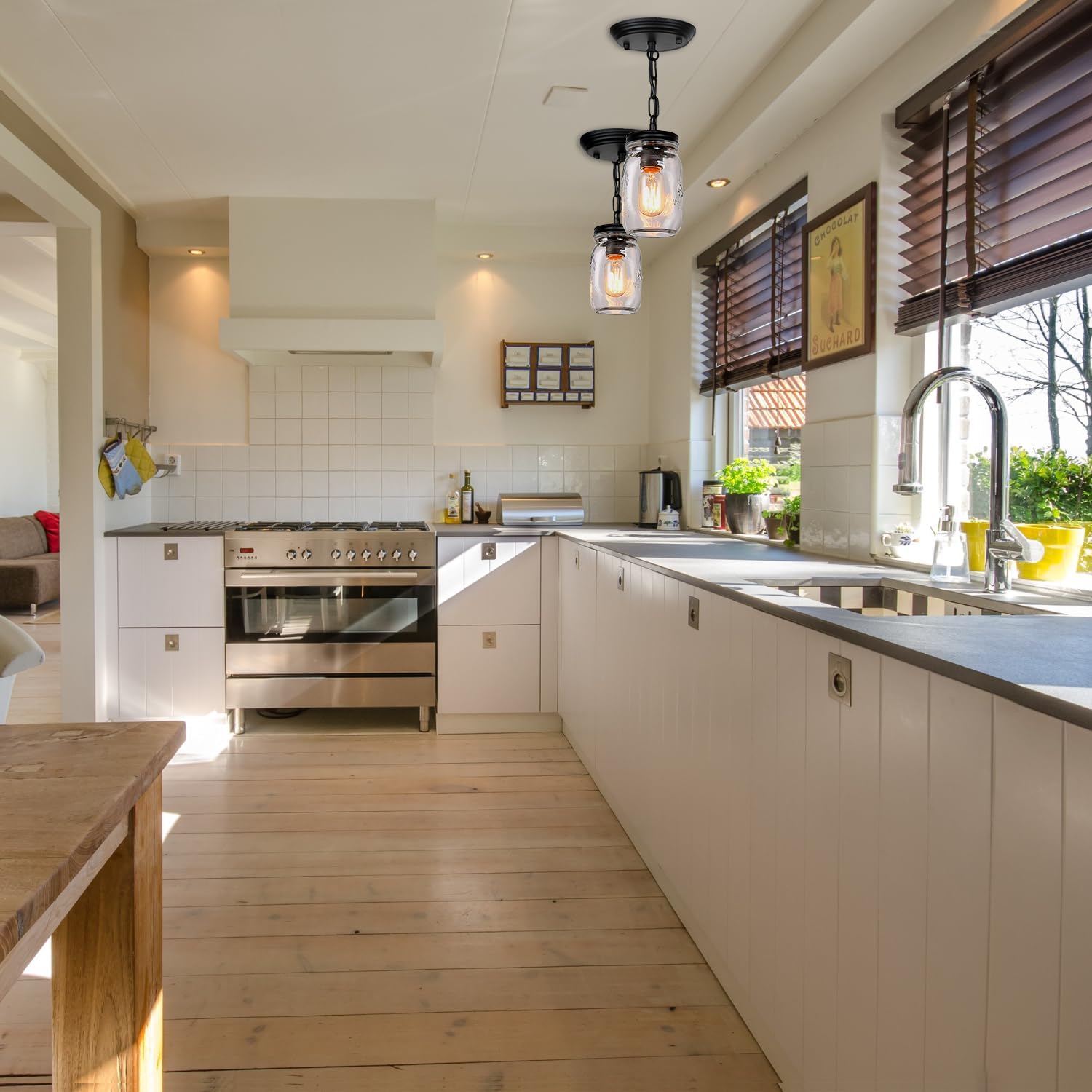 - 🔆Easy to assemble and install🔆 --This glass mason jar ceiling light for the kitchen island includes all the necessary parts for assembling and installation. With some experience and electrical knowledge, you can easily install it yourself in just a few minutes.