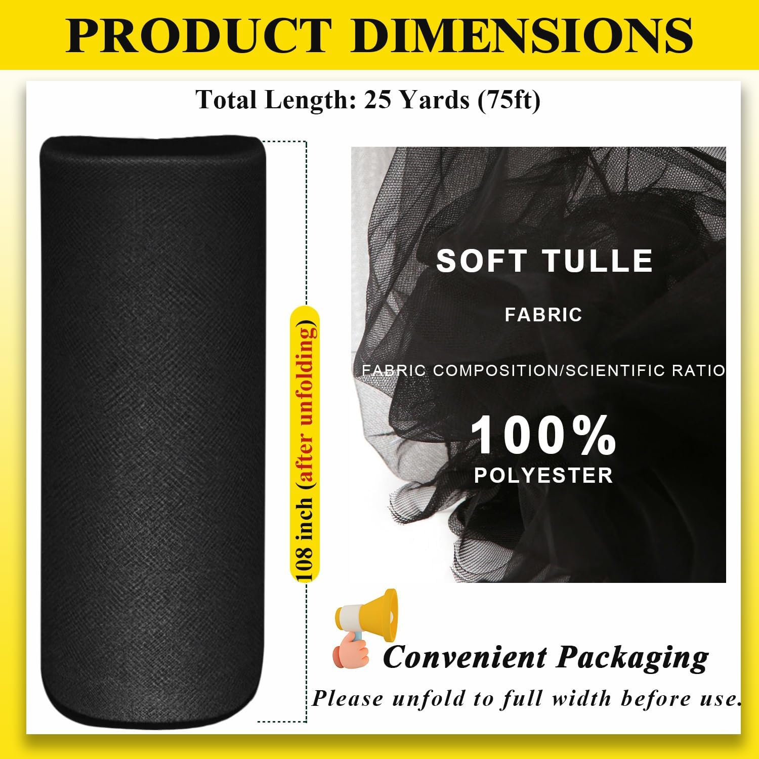 - Continuous and Complete: 108 inch x 25 yards (9x75 ft). Our tulle fabric has good wrinkle resistance and does not tear. Ultra-large area of elegant and durable tulle will meet your kinds of project.