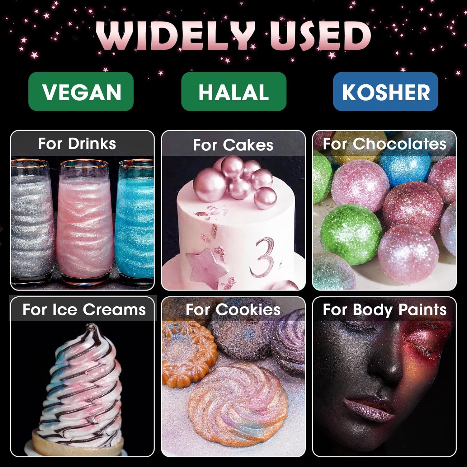 - 🌟【Vegan & Allergen-Free】Food-grade glitter uses only the highest quality vegan ingredients and does not contain common food allergens, including gluten, nuts or dairy products, so everyone can use and enjoy this product regardless of diet or food allergies. Unlike food contact glitter, these are 100% edible, so you don't need to worry about using them in your creations to make them sparkle for all.
