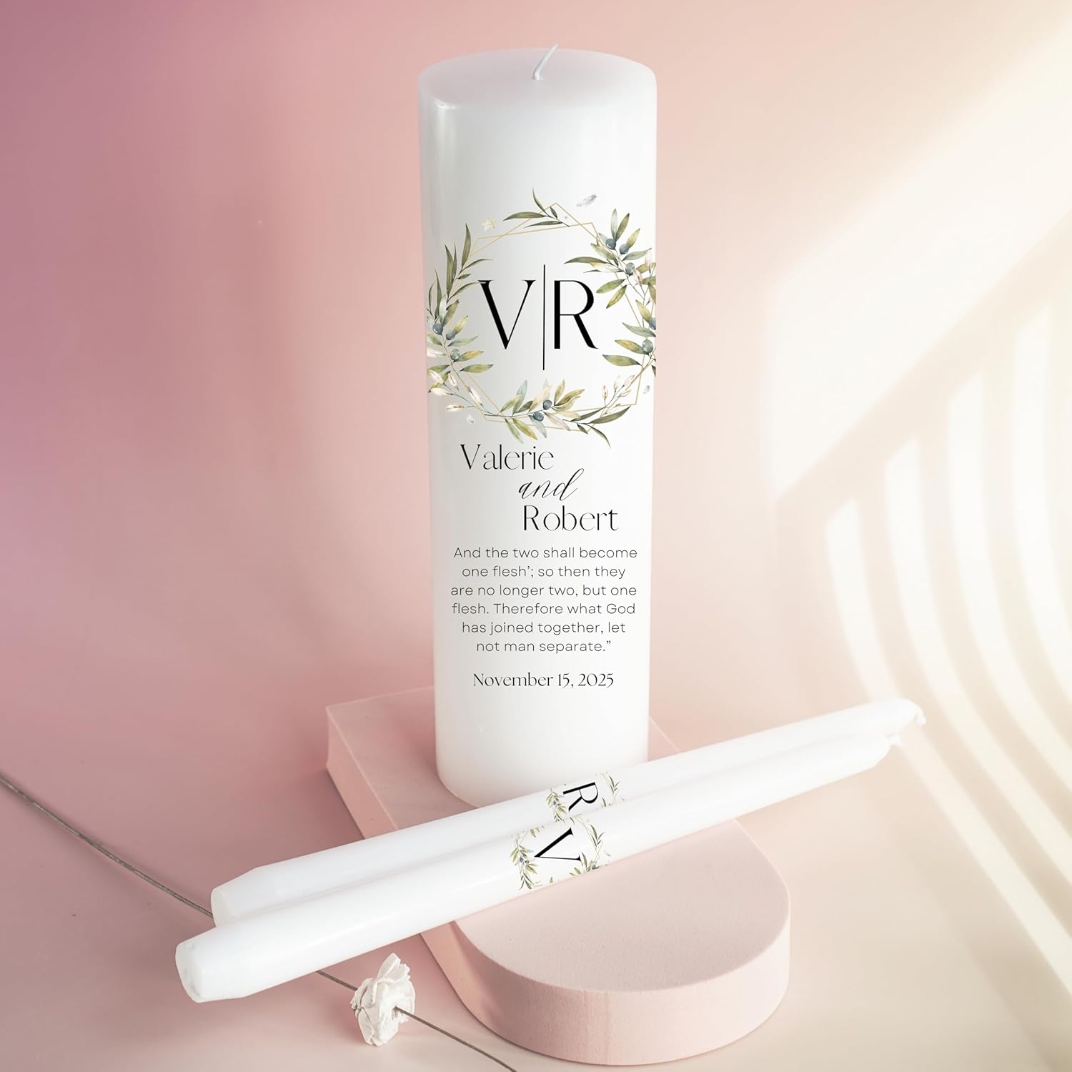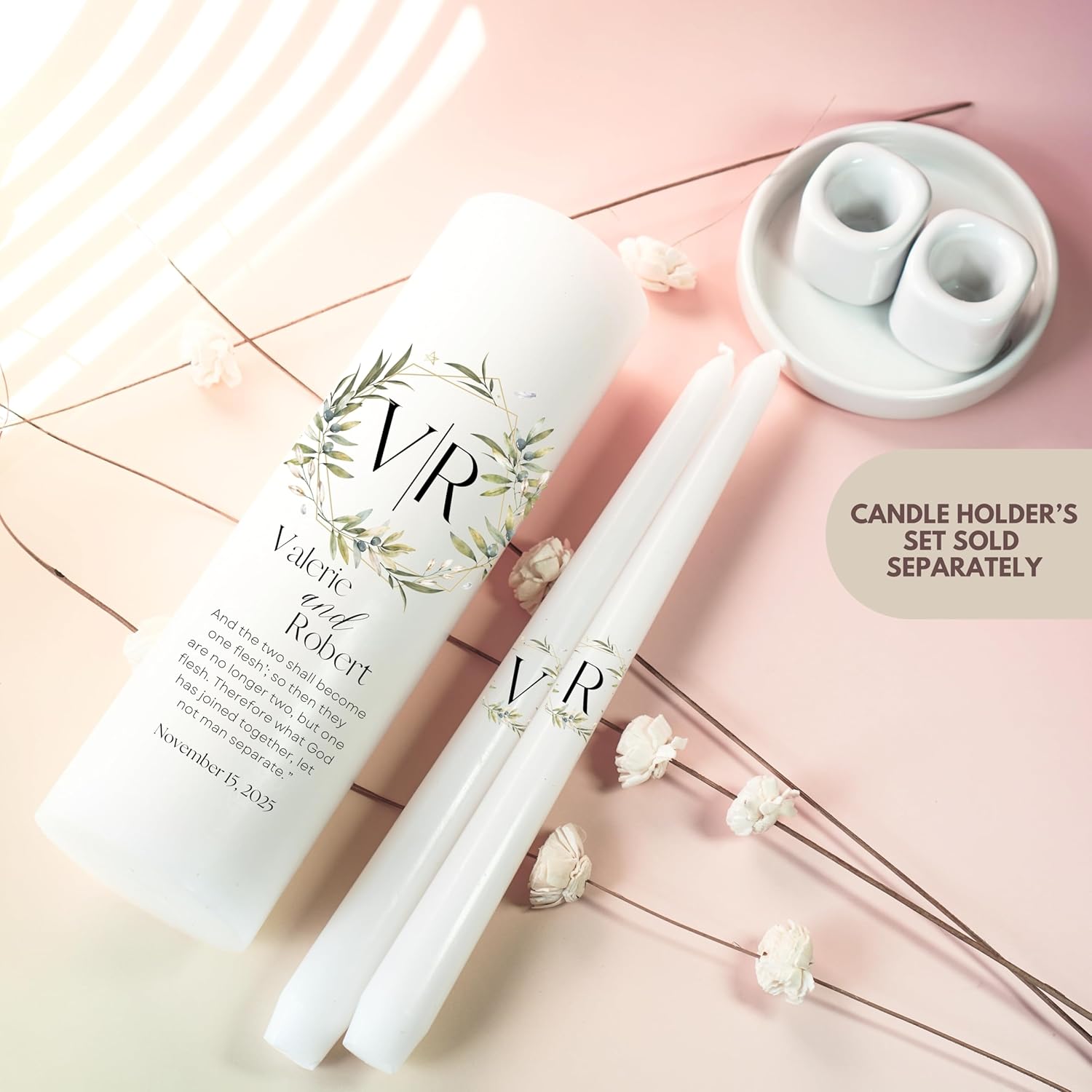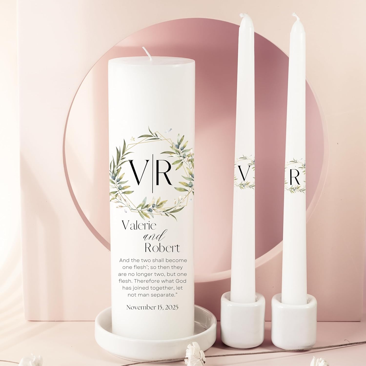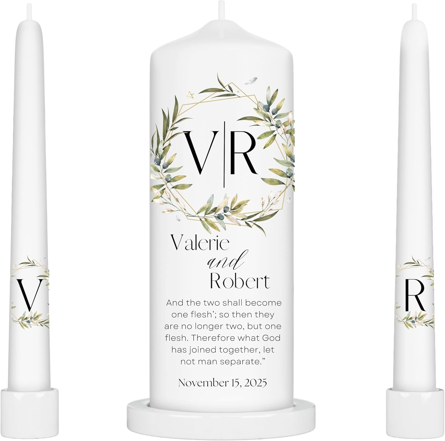 Unity Candles for Wedding, Modern Unity Set, Custom and Personalized Pillar and Taper Candles with Bible Quote, Unscented White Premium Wax, Religious and Wedding Ceremony, Special Events (Garden)