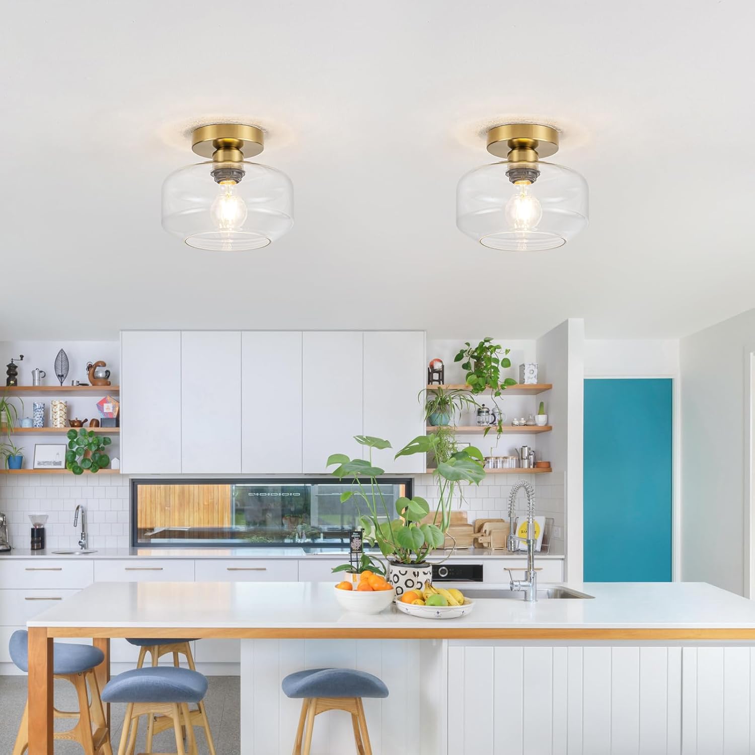 - 1️⃣ 【Premium Semi Flush Mount Design】 Vintage-inspired brass gold base with hand-blown clear glass shade creates crystal-clear illumination. Ideal as retro kitchen lighting fixtures ceiling or elegant hallway light fixtures.