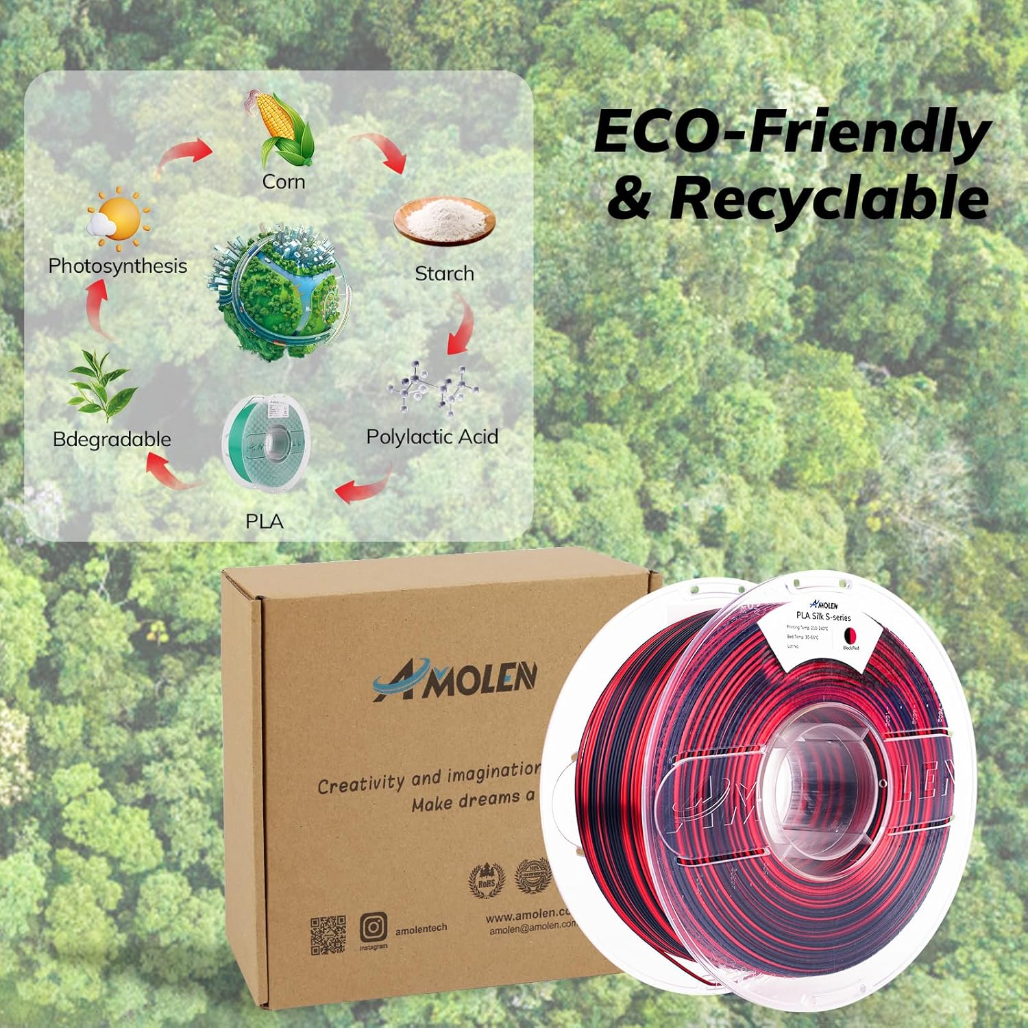- Reliable Printing: AMOLEN silk PLA filament raw materials from the USA. Good shaping, strong toughness, no bubble, no jamming, no warping, melt well, feed smoothly and constantly without clogging the nozzle or extruder. Beginner & expert friendly