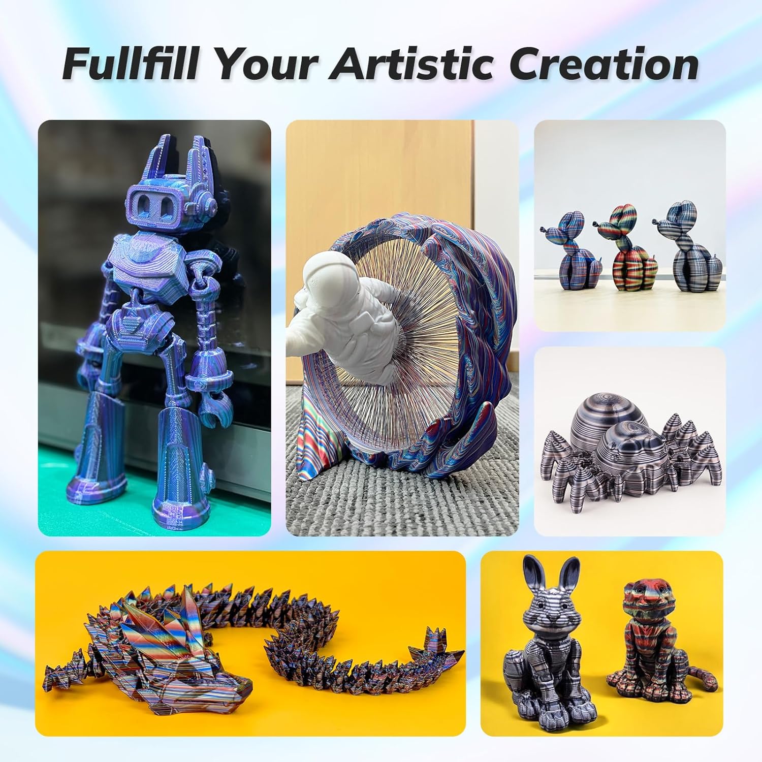 - Silk Multicolor Rainbow PLA: S-series is A line of multi-color spinning fast color change, spiral random color change bring your model more surprise effect. You can print beautiful multicolors in one PLA filament. Perfect for arts, crafts, DIY