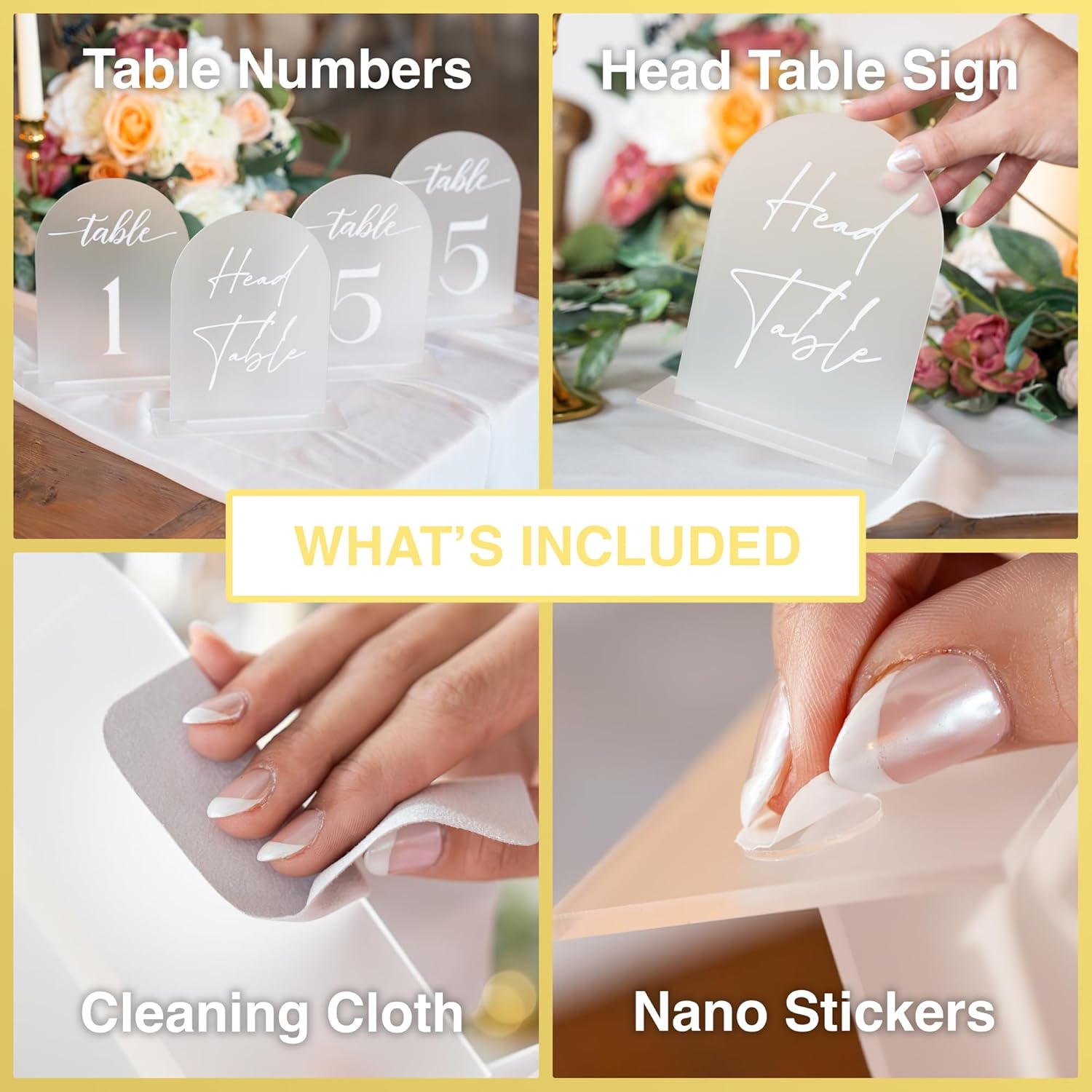 Frosted Arch Acrylic Table Numbers for Wedding Reception - 5" x 7" White Font Centerpiece Set with Holder Stands & Head Table Sign - Anniversary, Event, Party, Wedding set 1-15