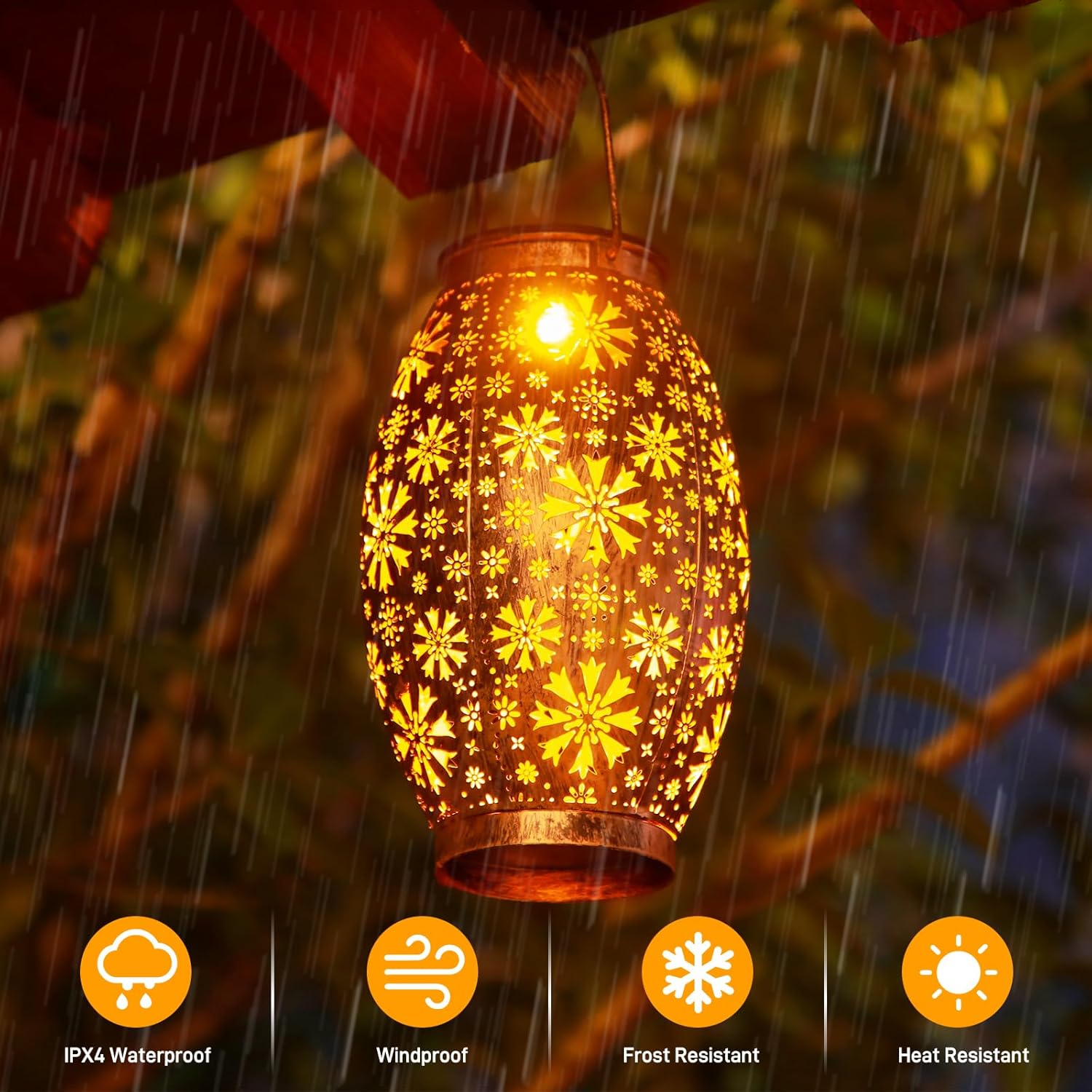 - WATERPROOF & RUSTPROOF: Crafted from high-quality plastic and premium metal, these garden solar lanterns are waterproof (IPX4), heatproof, and prepared for whatever weather comes their way. Better yet, the switch is designed on the inside of the lamp for an extra waterproof effect. (Note: Do not immerse the light in water.)