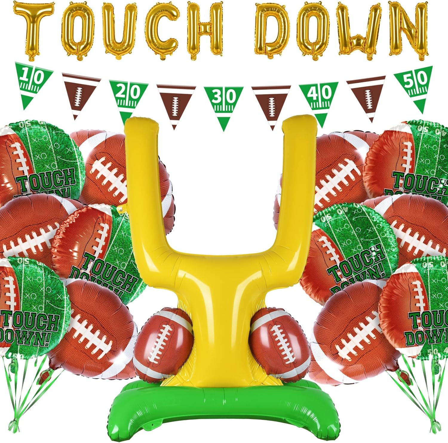 Football Party Supplies Kit - Touchdown Letter Balloon, Goal Post & Football Shaped Foil Balloons, Round 'Touchdown!' Foil Balloons, and Banner for Birthday, Game day, Tailgate Party Decorations