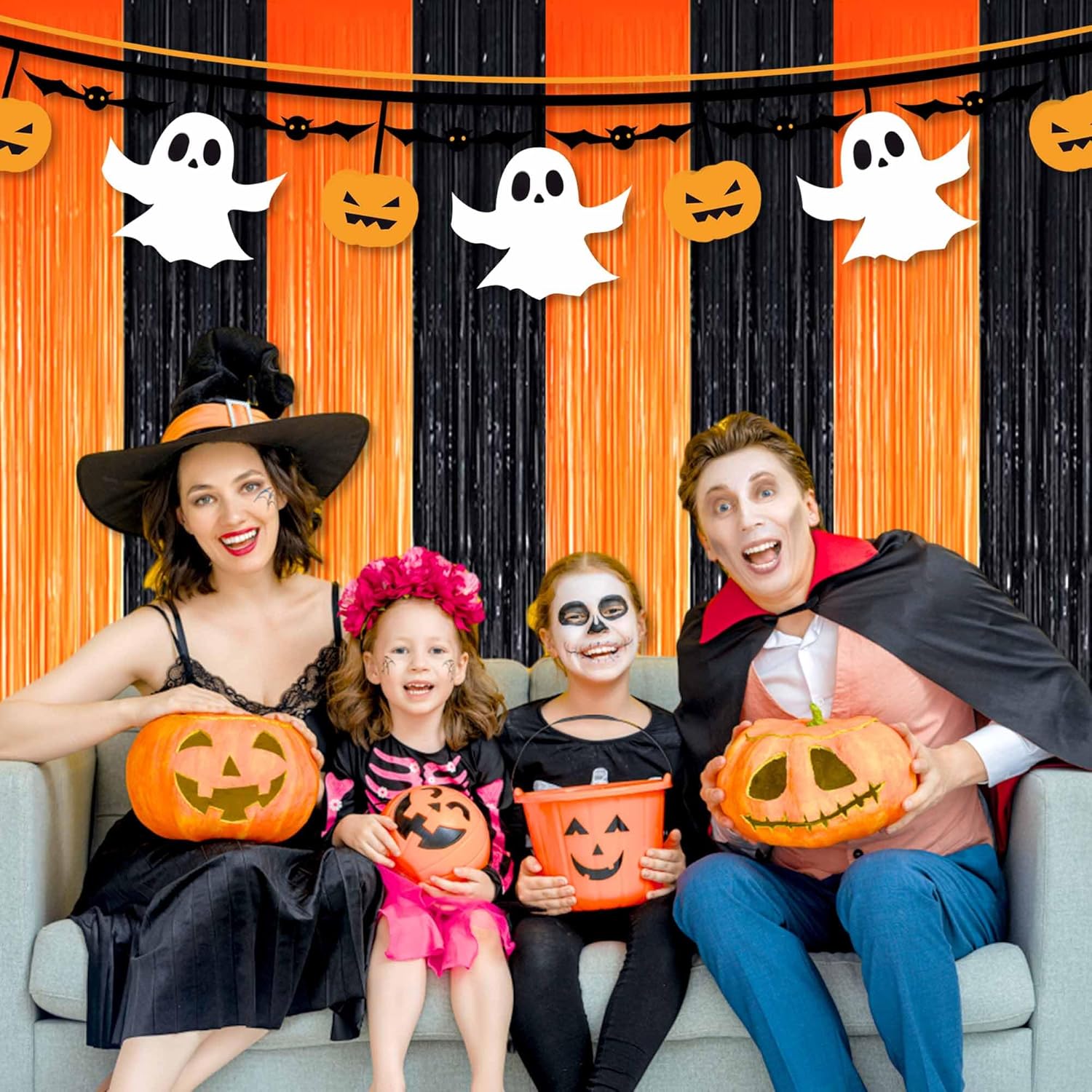 3 Pack Black Orange Foil Fringe Curtains Backdrop, 3.28 x 9.8 Ft Metallic Streamers Tinsel Curtains Background for Photo Booth, Birthday, Halloween, Christmas, Thanksgiving, New Year Party Decorations