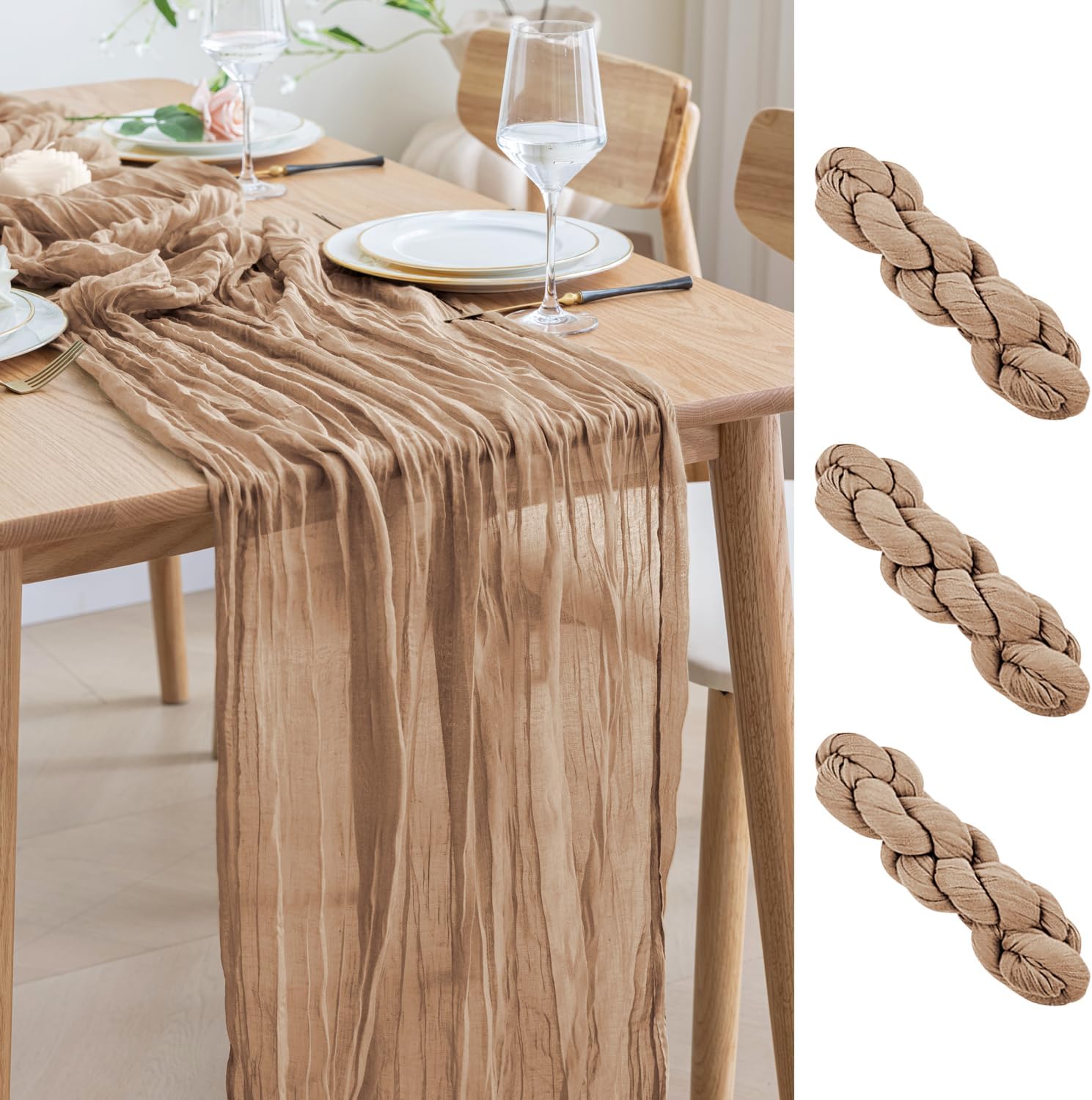 - 【Cheesecloth Table Runner】 Size: 35" W x 120" L. You will get 3 pieces 10FT length cheesecloth table runner. The sheer rustic table runner is long enough to span a large table and drape gracefully across the table. It will gently sway in the wind, adding a romantic atmosphere to your occasion. These eye-catching gauze table runners are ideal for arranging an elegant, stylish tablescape.