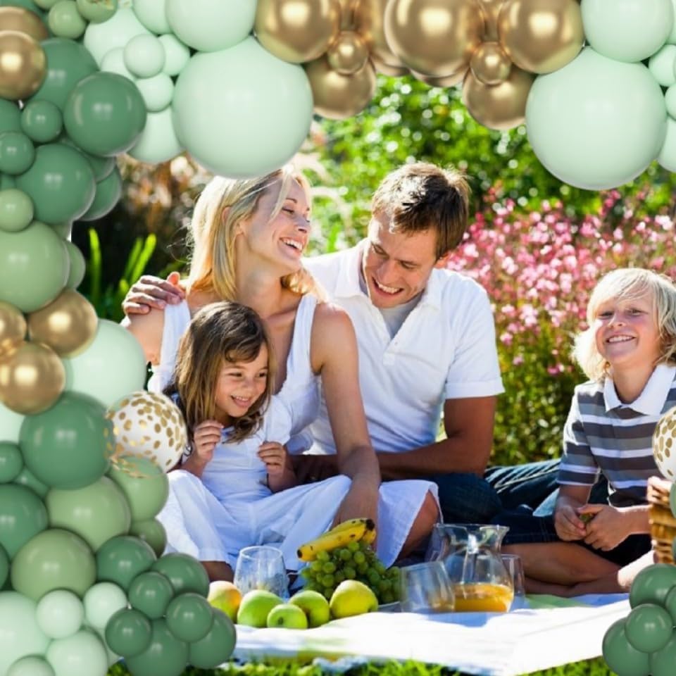 - Sufficient Quantity of Green Balloons: The sage green balloon garland includes 18β sage green/olive green/pastel green balloons(3 pcs), 12β sage green/olive green/pastel green/metallic gold/confetti gold balloons(25 pcs), 10β sage green/olive gree/pastel green/metallic gold balloons(50 pcs), 5β sage green/olive green/pastel green/metallic gold balloons (65 pcs) and 10 pcs balloon tools(balloon arch strips, tying tool, 100 glue points, ribbon, flower balloon clip, hook)