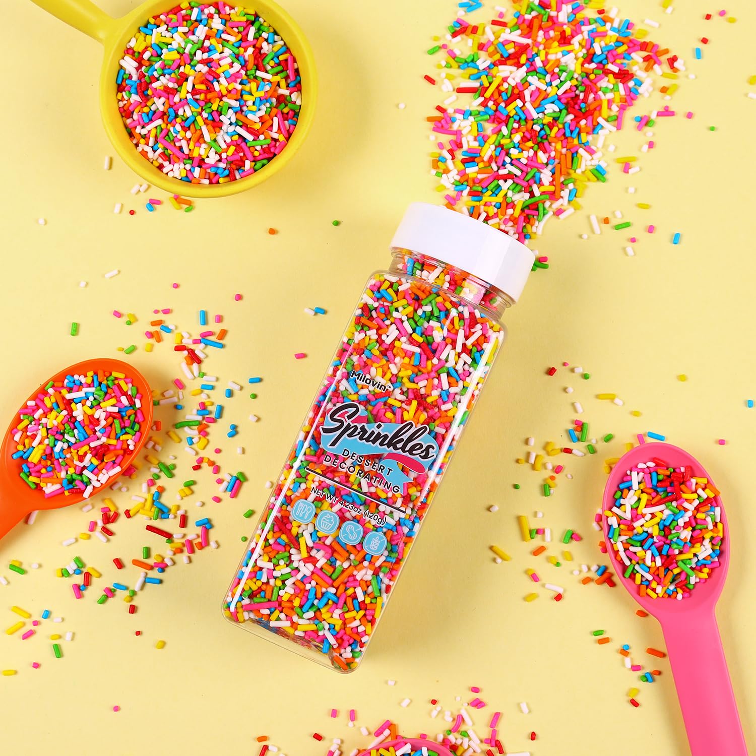 - Rainbow Sprinkles for Cake Decorating: A bottle of edible rainbow sprinkles(120g/4.23oz), whether it's cakes, cupcakes, cookies, ice cream, cake pops, brownies, or any dessert you can dream of; our rainbow sprinkles are your go-to for that extra dash of cheer.