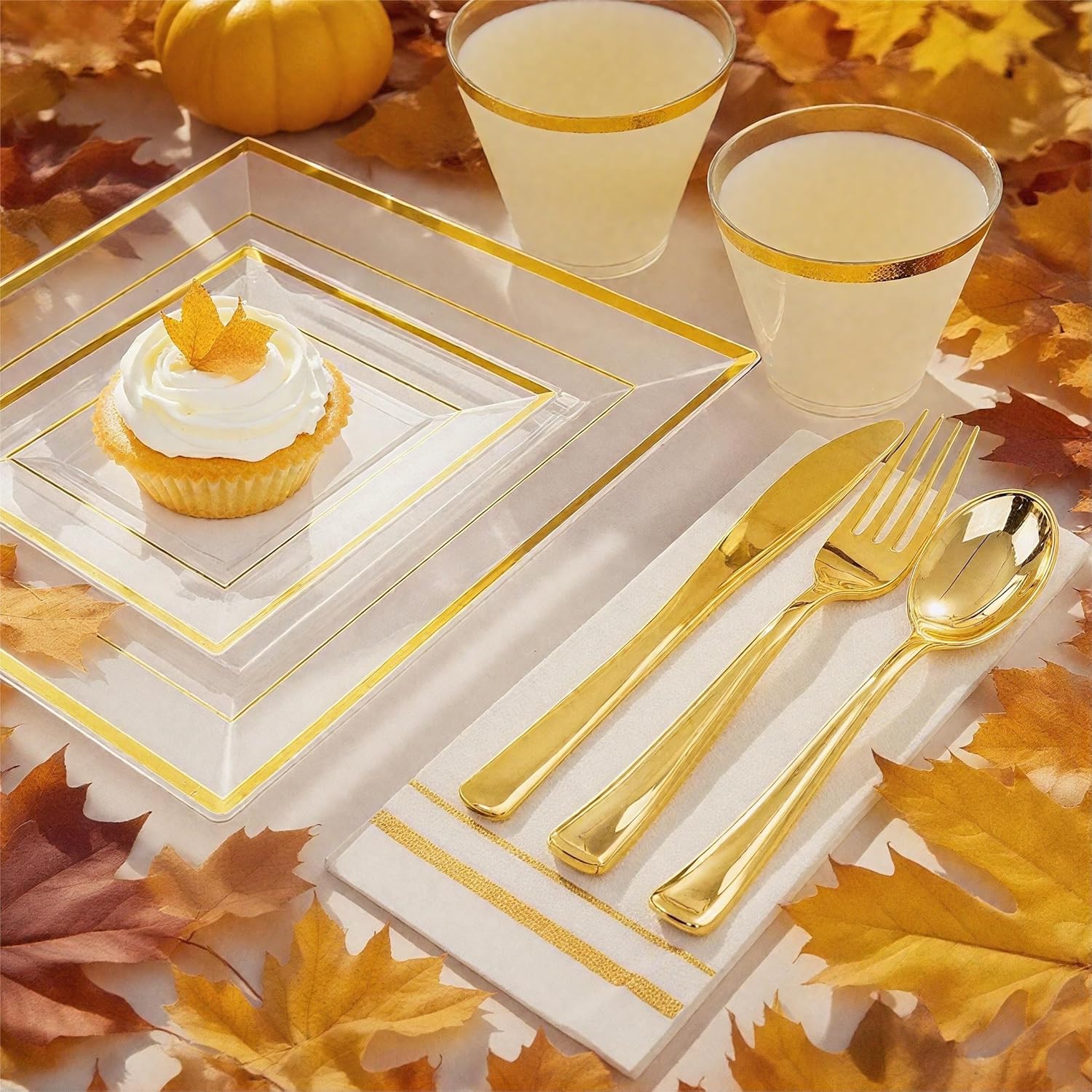 Festiva 350Pcs Clear Plastic Plates with Gold rim - Clear Gold Disposable Dinnerware for 50 Guests include 100 Square Plastic Plates 50Cups 50Cutlery 50Napkins Perfect for Thanksgiving Party&Wedding