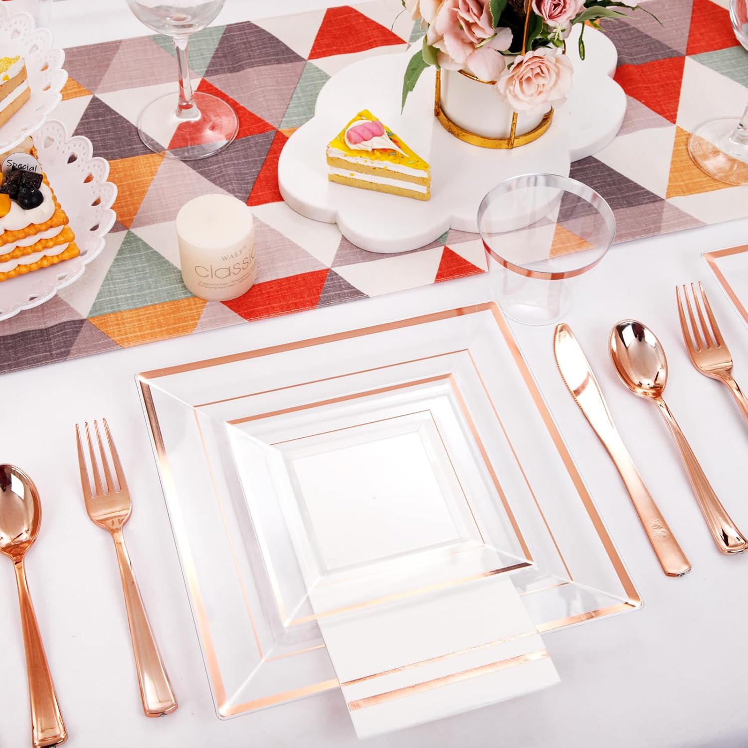 - VALUE SET: This rose gold plastic plates set includes 50pcs 9.5" clear rose gold dinner plates, 50pcs 6" clear rose gold dessert plates, 50 sets of rose gold plastic silverware, 50pcs rose gold rim cups and 50pcs 13*15.7 inches (unfolded size) napkins, our clear and rose gold disposable plates solve everything you need for dining, making it easy for you to hold a party and enjoy a good time.