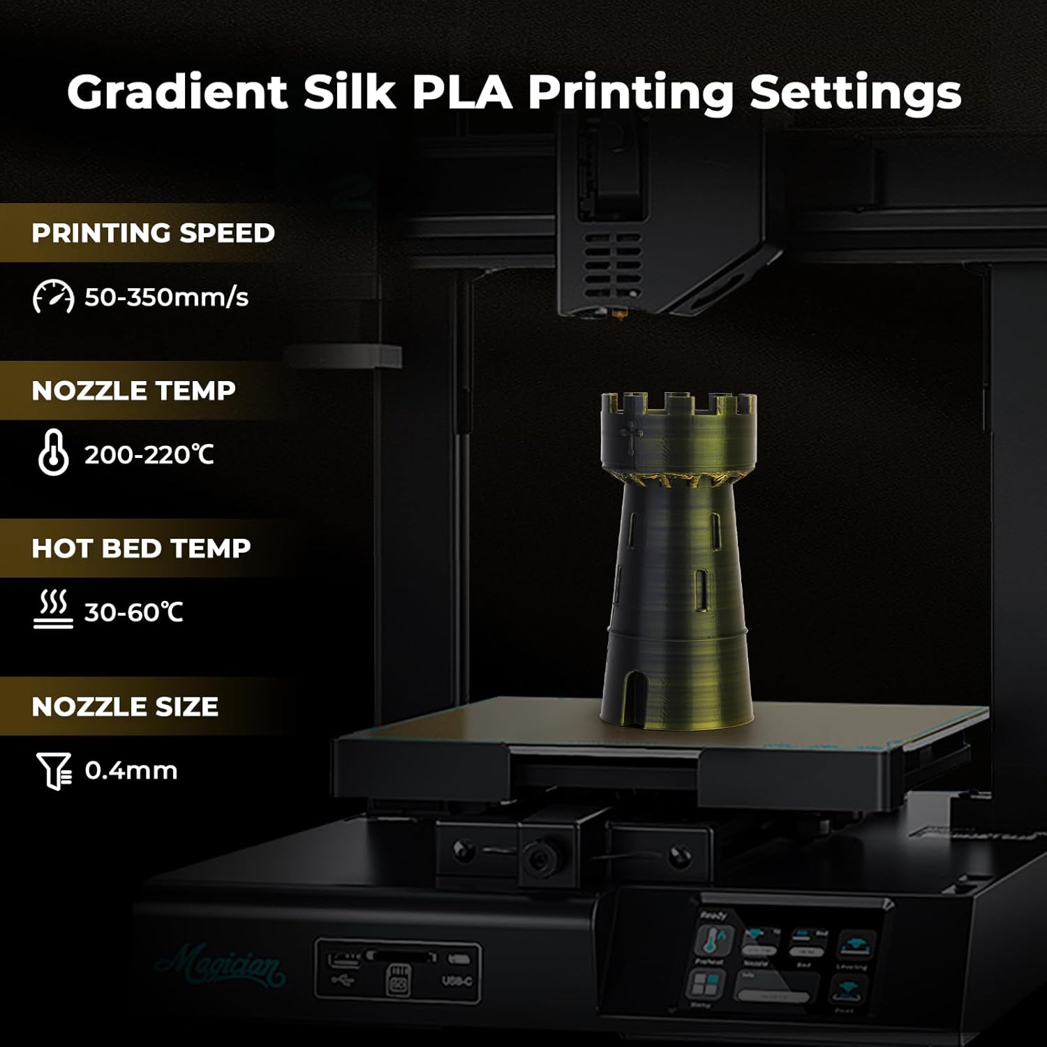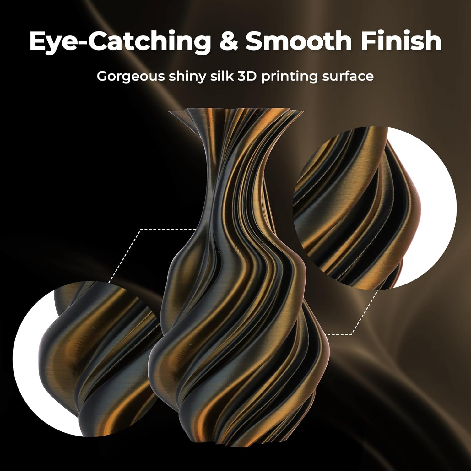 - Eye-catching Silk PLA: Shiny black and gold combination of magic 1.75mm PLA filament, make the two sides of your print appear in different colors. Without polishing, you can get a silk glossy and smooth 3d prints. Beginner & expert friendly, it’s your go-to for eye-catching designs all year round