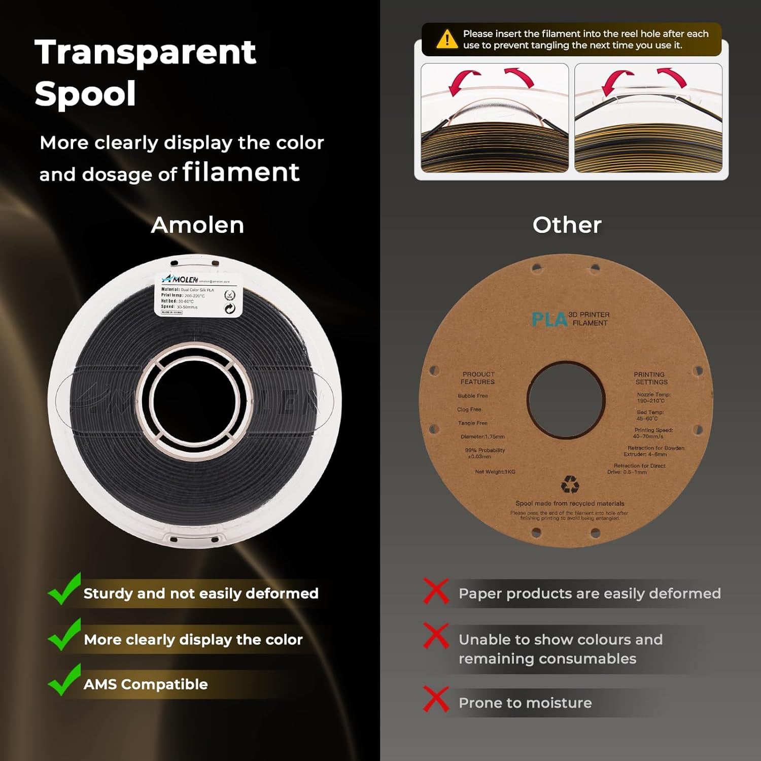 - Smooth and Reliable Printing: Experience smooth printing with AMOLEN silk PLA filament. Good shaping, strong toughness, no bubble, no jamming, no warping, melt well, feed smoothly and constantly without clogging the nozzle or extruder