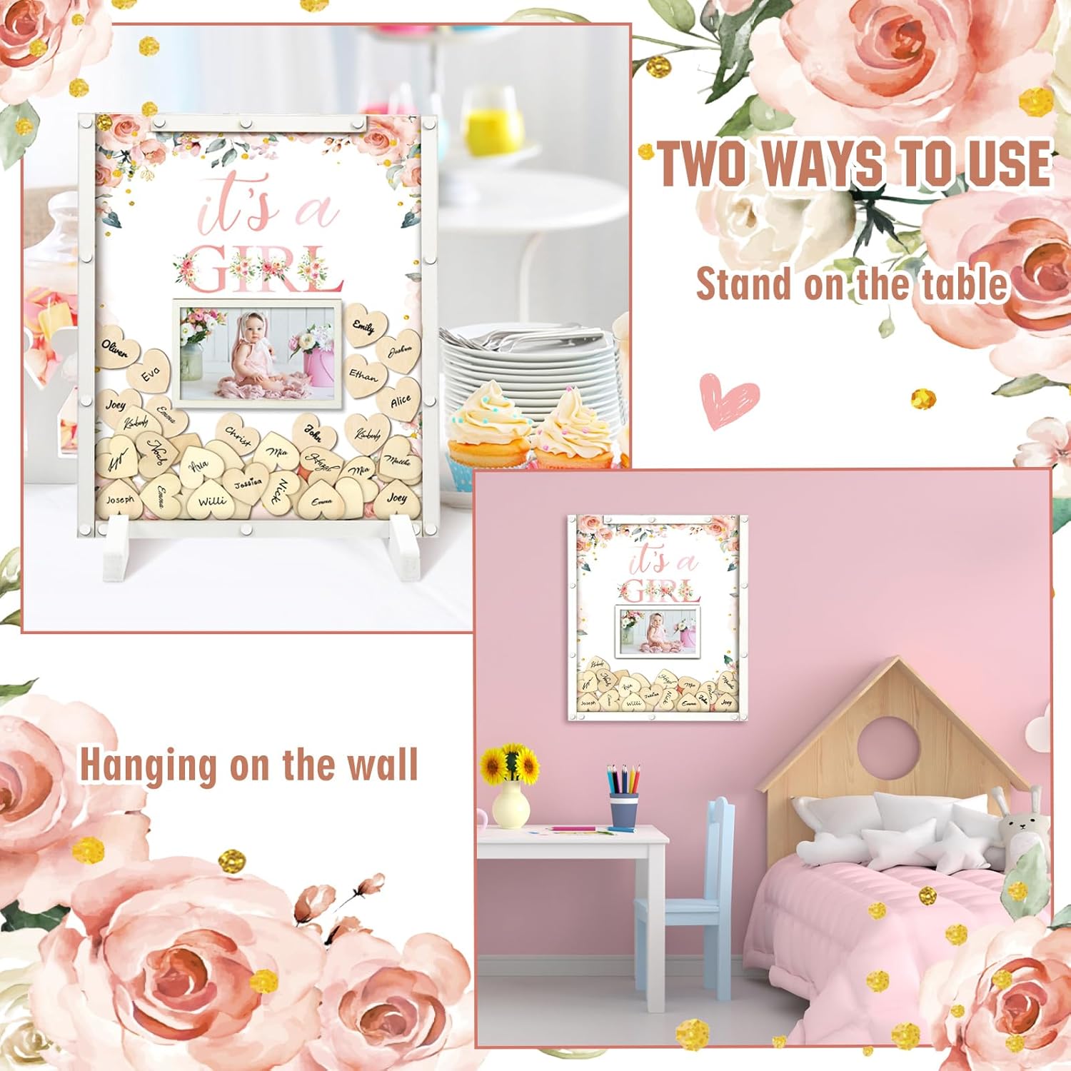 65 Pcs Baby Shower Guest Book Decorations Baby Shower Sign in Guest Book Alternatives Floral It's a Girl Decorations with Photo Frame and 60 Wood Slices Keepsakes for Guests