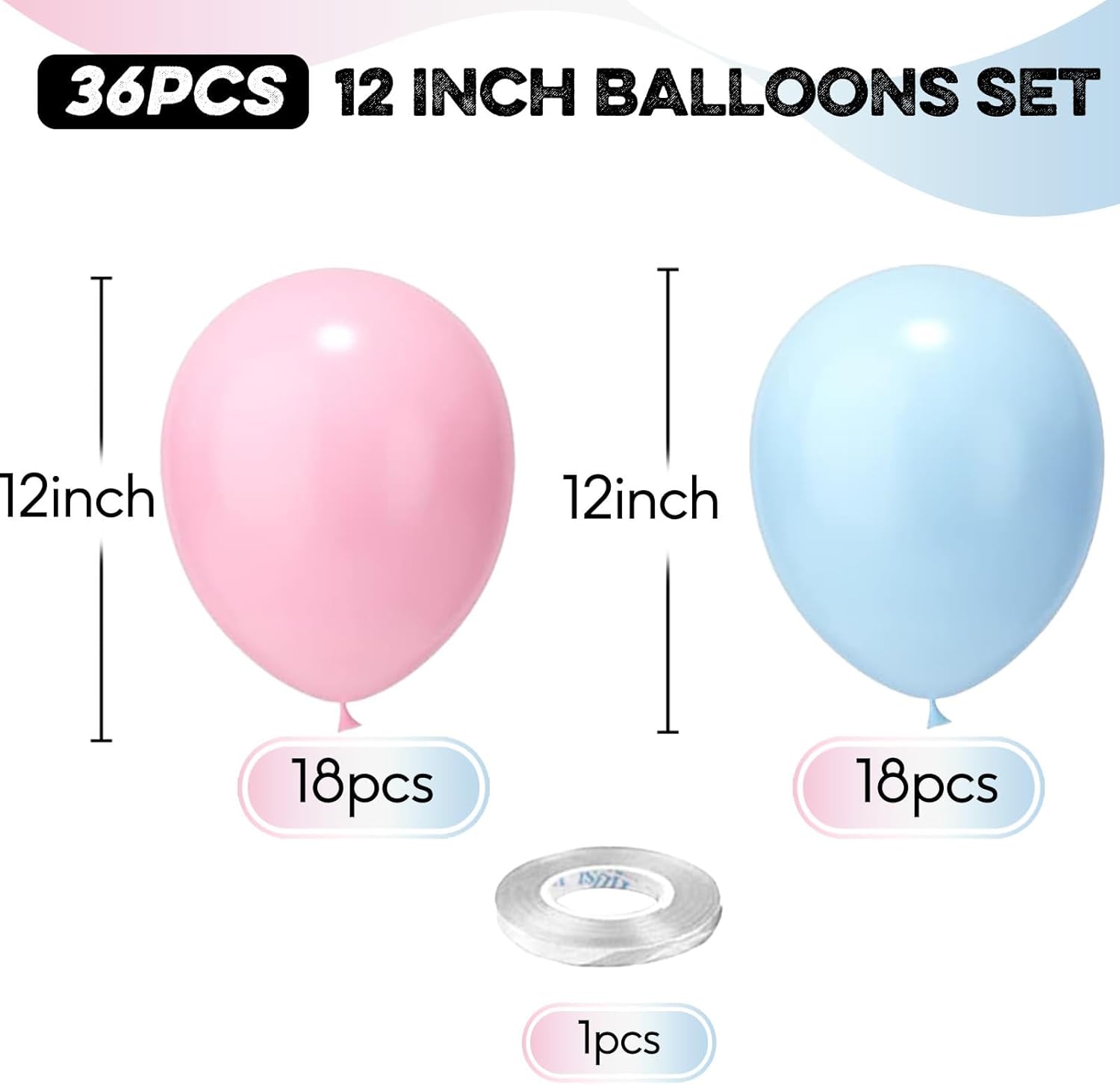 - Blue Pink Balloons: 36pcs 12 inch balloons set, include 18pcs light blue balloons and 18pcs light pink balloons and 1pc white ribbon. The dreamy macaron blue pink themed balloons, featuring soft and pink tones, infuse vitality and liveliness into the party.