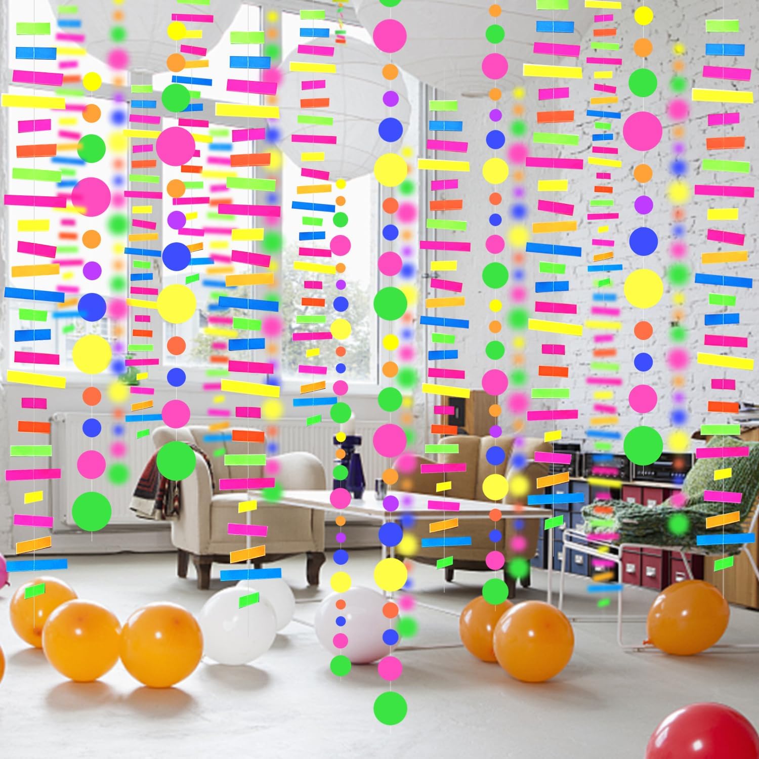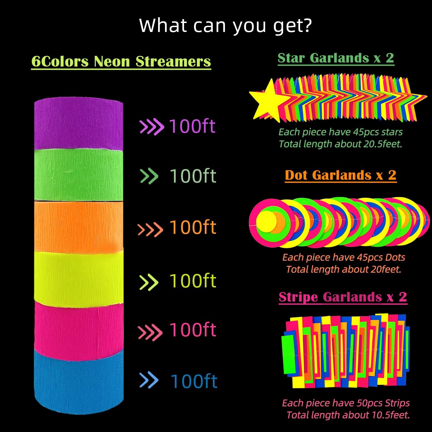- 【What you can GET 】 Package Include: 600 Ft /6 Rolls long neon streamers;42 Ft/2pcs Star neon garland; 40 Ft/2pcs Round dot fluorescent garland; 21 Ft/2pcs Rectangle neon Strip.