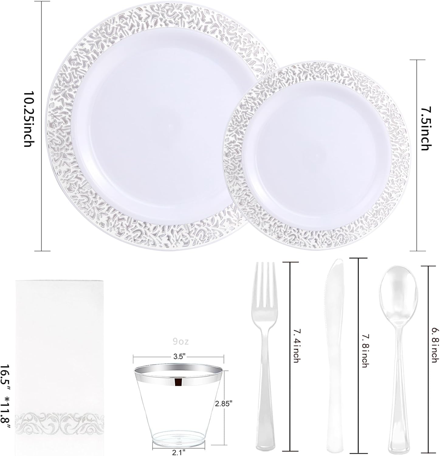 - Chic Tableware: The silver plastic dinnerware set includes 50 paper napkins with a silver pattern that adds elegance to our party decorations. Not only are these paper napkins absorbent and practical, but they also enhance the overall aesthetics of the event