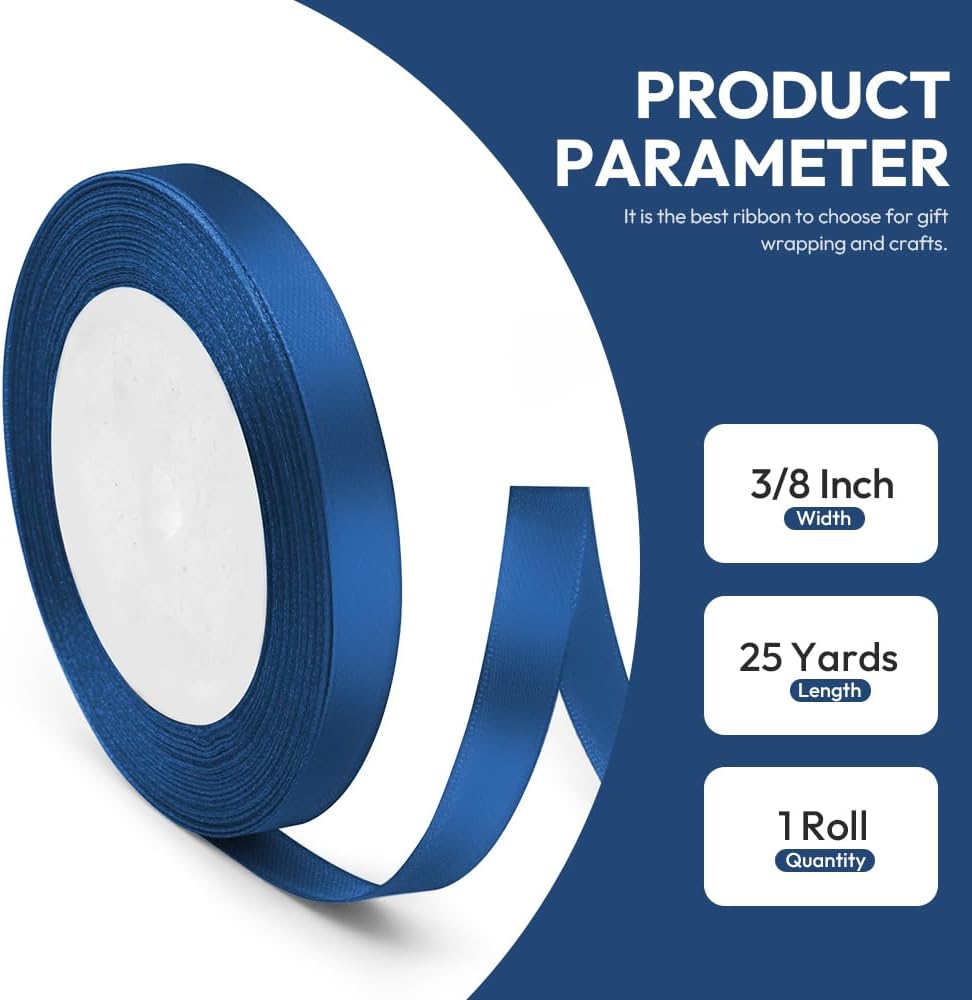 3/8" x 25 Yards Satin Ribbon, Navy Blue Silk Ribbon Ideal for Gift Wrapping, Floral Bouquets, Crafts, Wedding Party Decorations, Christmas and Sewing Projects