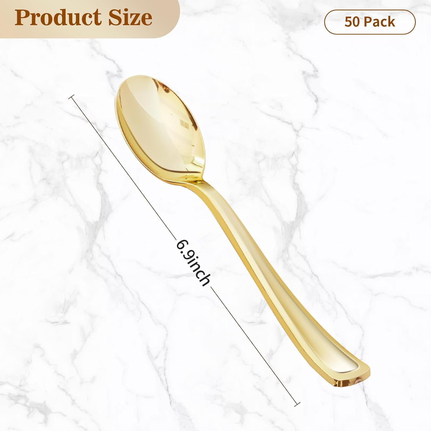 - Fantastic Value Pack - This set features 50 exquisite gold plastic spoons, each measuring 6.9 inches long. Elevate your dining experience by pairing them with our forks and knives for an even more perfect presentation. Please note that these Plastic Disposables are not suitable for use in microwaves, ovens, or dishwashers.