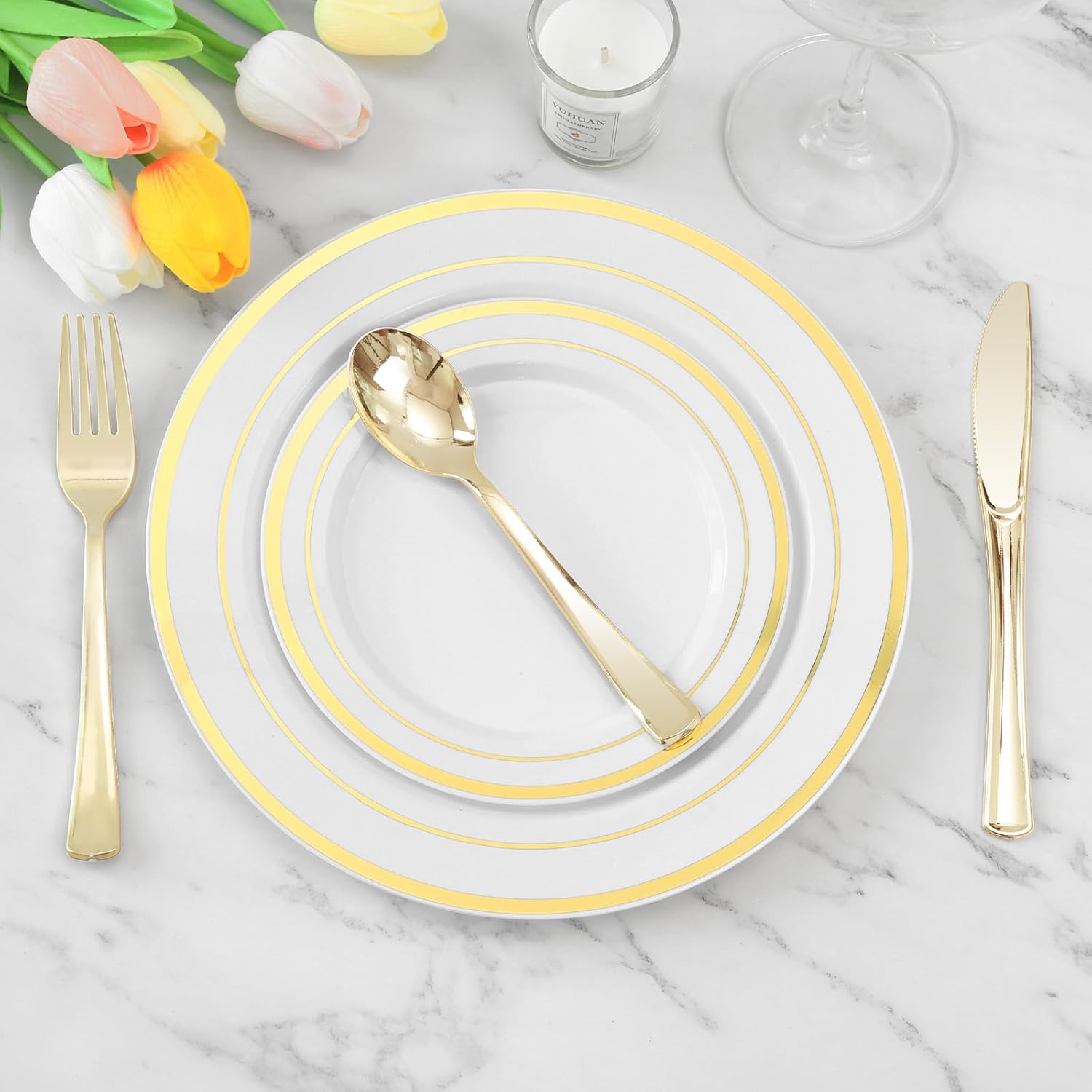 - Easy to Use - The gold spoons silverware provide a comfortable grip and are suitable for stirring and serving various dishes, desserts, and more. After use, dispose of the Plastic Disposables in the trash, simplifying post-meal cleanup and saving time for quality moments with friends or family. For reusability, simply wash the dishes with water.