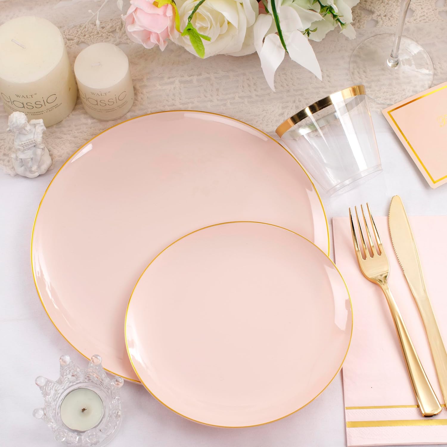 - VALUE PACK FOR 50 GUESTS: NOCCUR pink and gold plastic plates contain 50 dinner plates, 50 dessert plates, 150 gold plastic cutlery, 50 cups and 50 napkins. These pink plastic dinnerware set are enough to hold a wonderful party for 50 guests!
