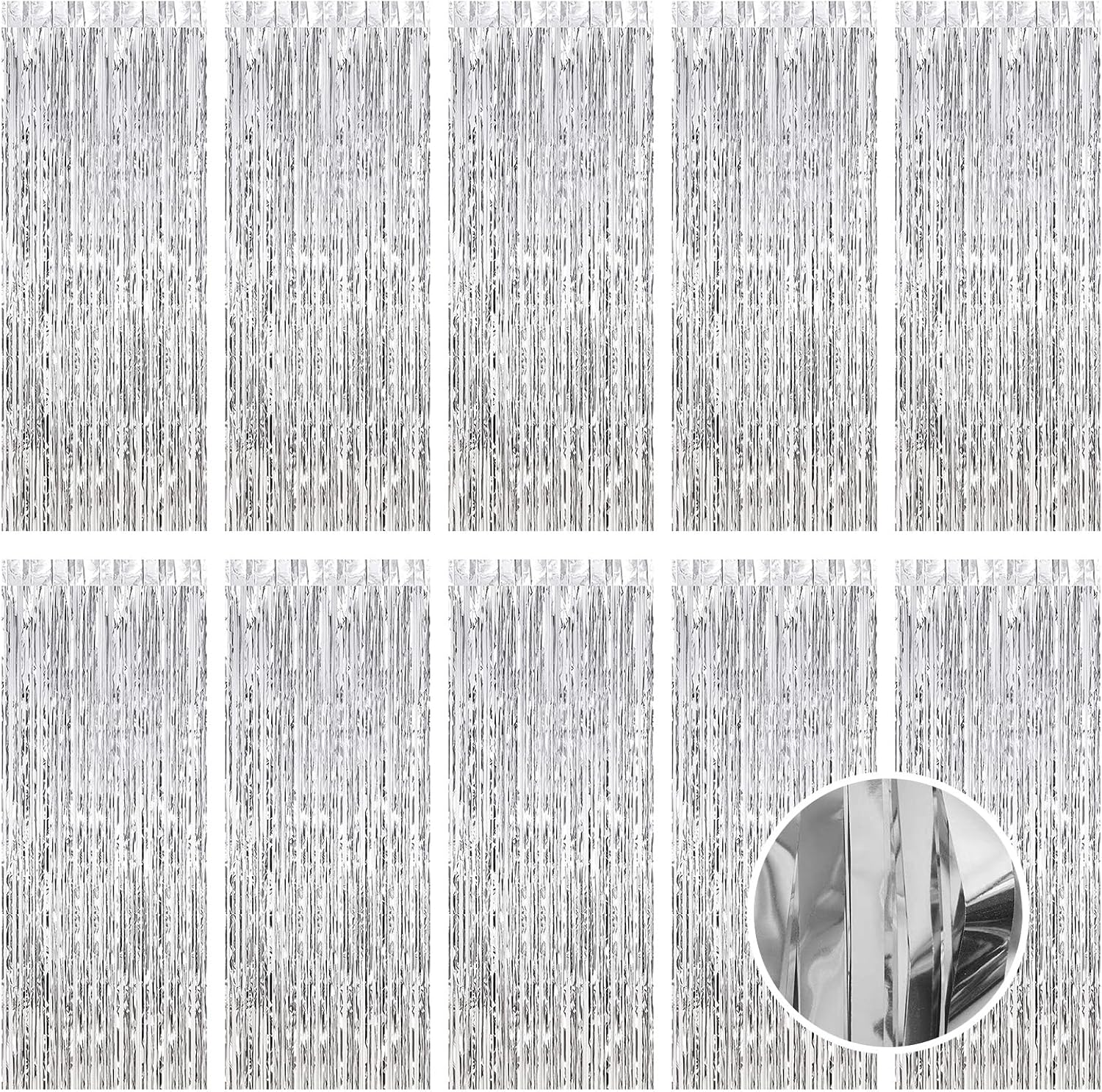 10 Pack Silver Foil Curtain Backdrop 3.2ft x 9.8ft Metallic Tinsel Foil Fringe Curtains Streamer Photo Booth Backdrop for Birthday Party Engagement Bachelorette Party Decorations (Silver)