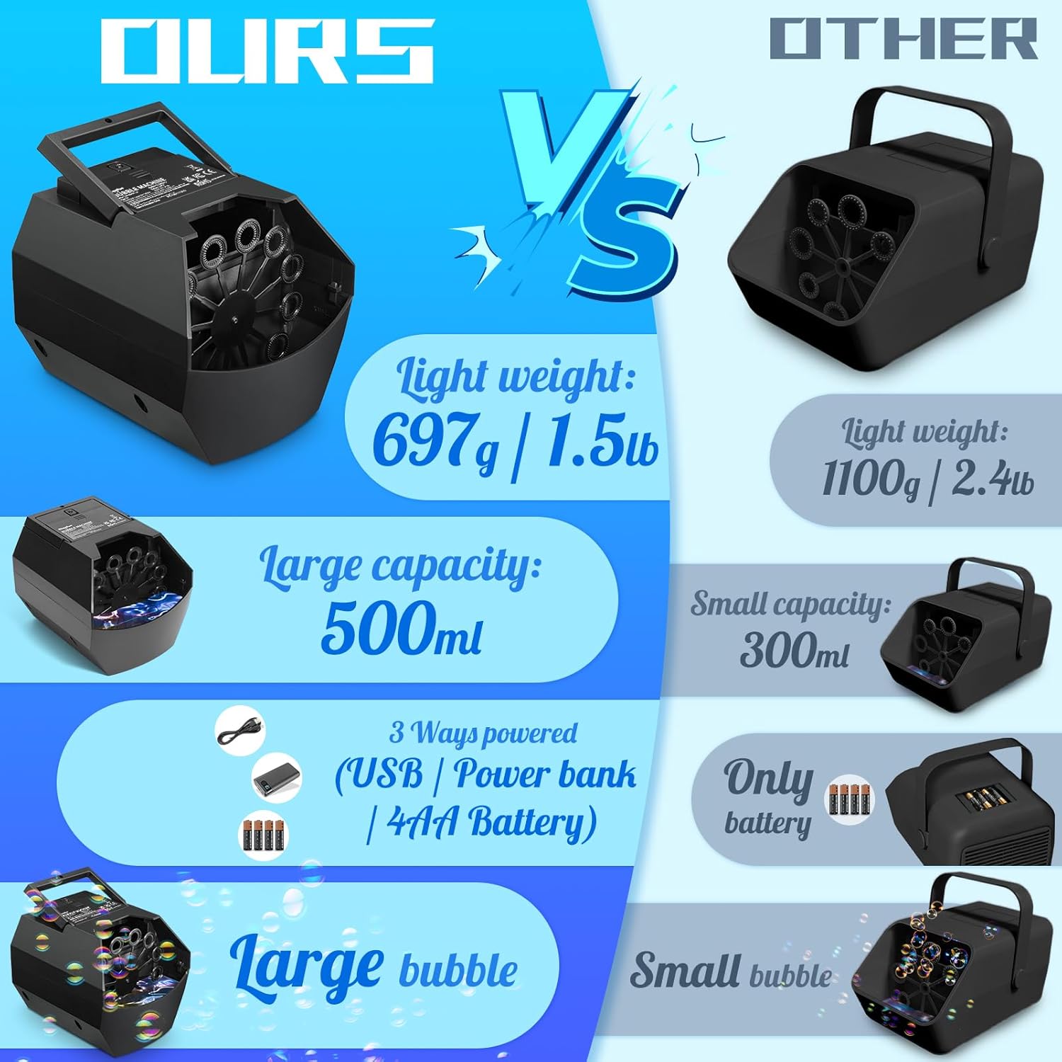 - 500ML High Capacity For Continuous Use: The larger 500ml/17oz capacity of the solution tank can hold up to 45+ mins for continuous use. It is not necessary to add bubble liquid during a party, wedding, or birthday so that you can enjoy uninterrupted happy bubble time