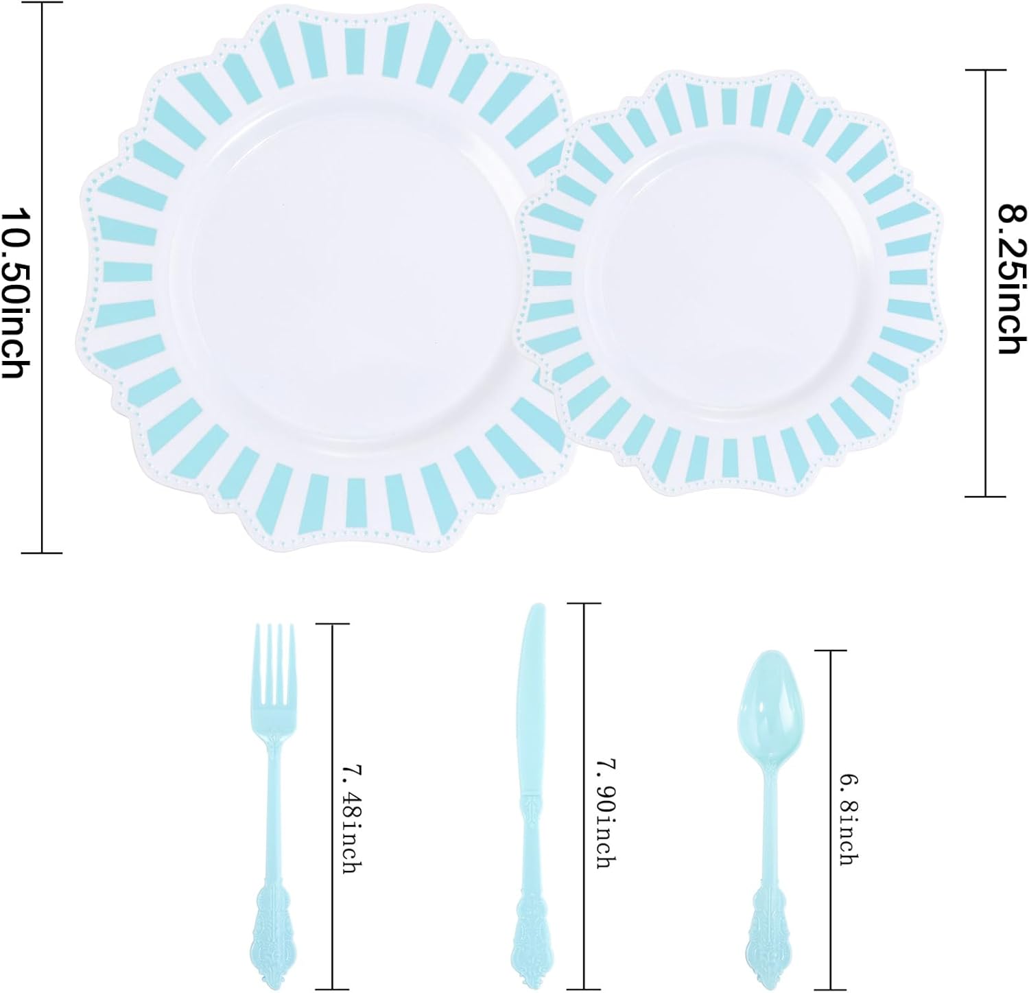 - [Unique Design] The White with Blue Striped Plastic Dinner Plate and Dessert Plates with light blue color printed match with same blue color silverware. No matter shape design and the printing design of the plastic plates and the plastic knife fork spoon is all Unique.