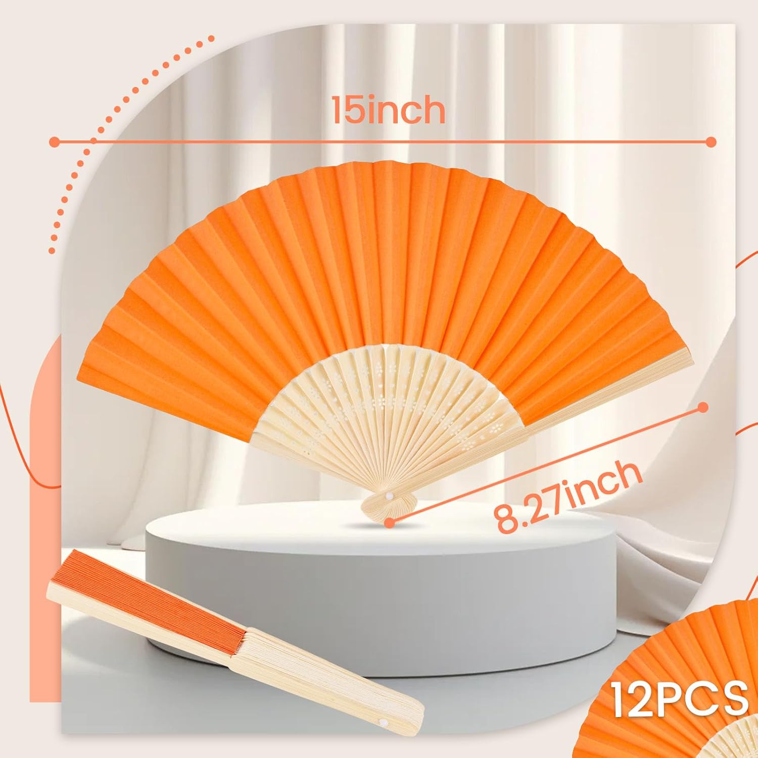 - Party and Wedding Must-Have · Photo-Ready Prop – This set includes 12PCS orange paper folding fans (each about 8.3 inches long), making them an eye-catching choice for weddings, orange party decorations, summer events, or festive dance parties. Each handheld fan opens and closes smoothly with one hand and creates a quiet, fluid motion that won’t interrupt the music or atmosphere. From party photos to lively gatherings, these folding fans add both style and movement.