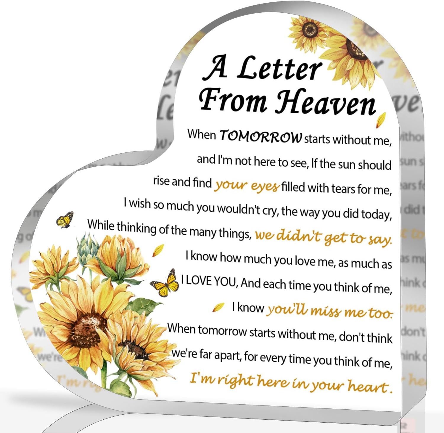 Sympathy Gifts - A Letter from Heaven- Memorial Gift for Loss of Mother Father Husband Son, Acrylic Heart Keepsake,Remembrance Sympathy Gifts (Sunflower)