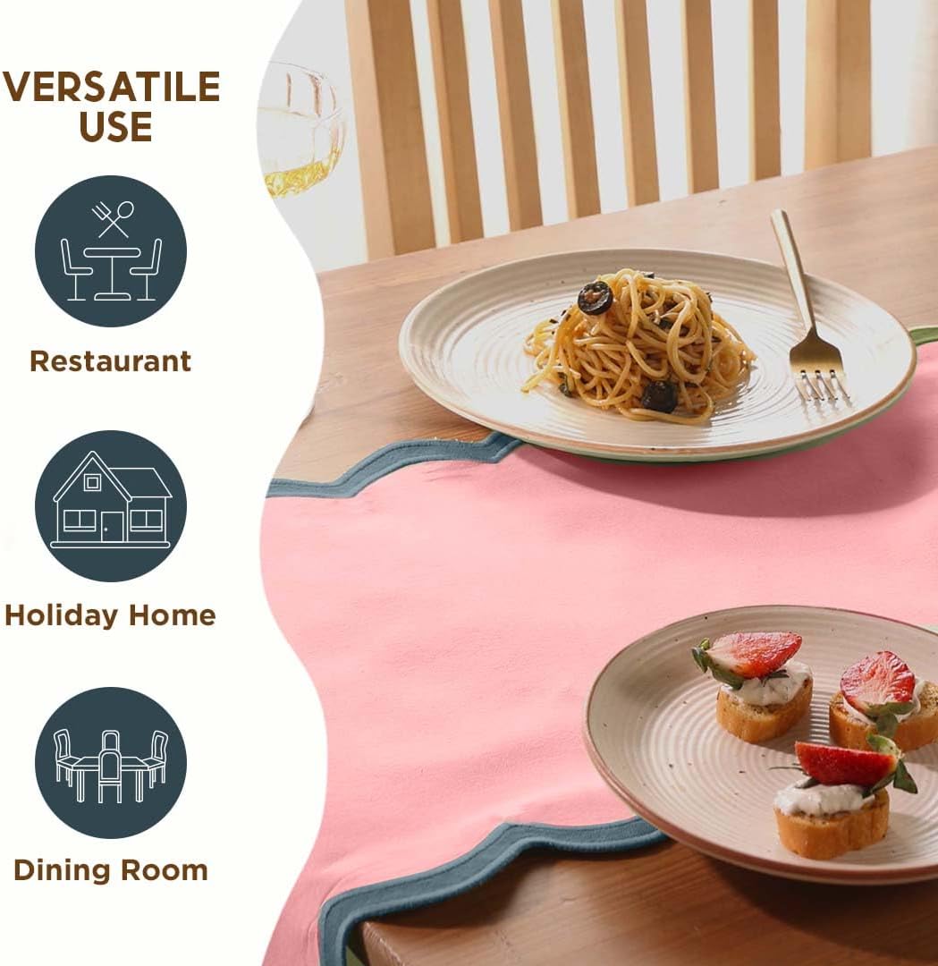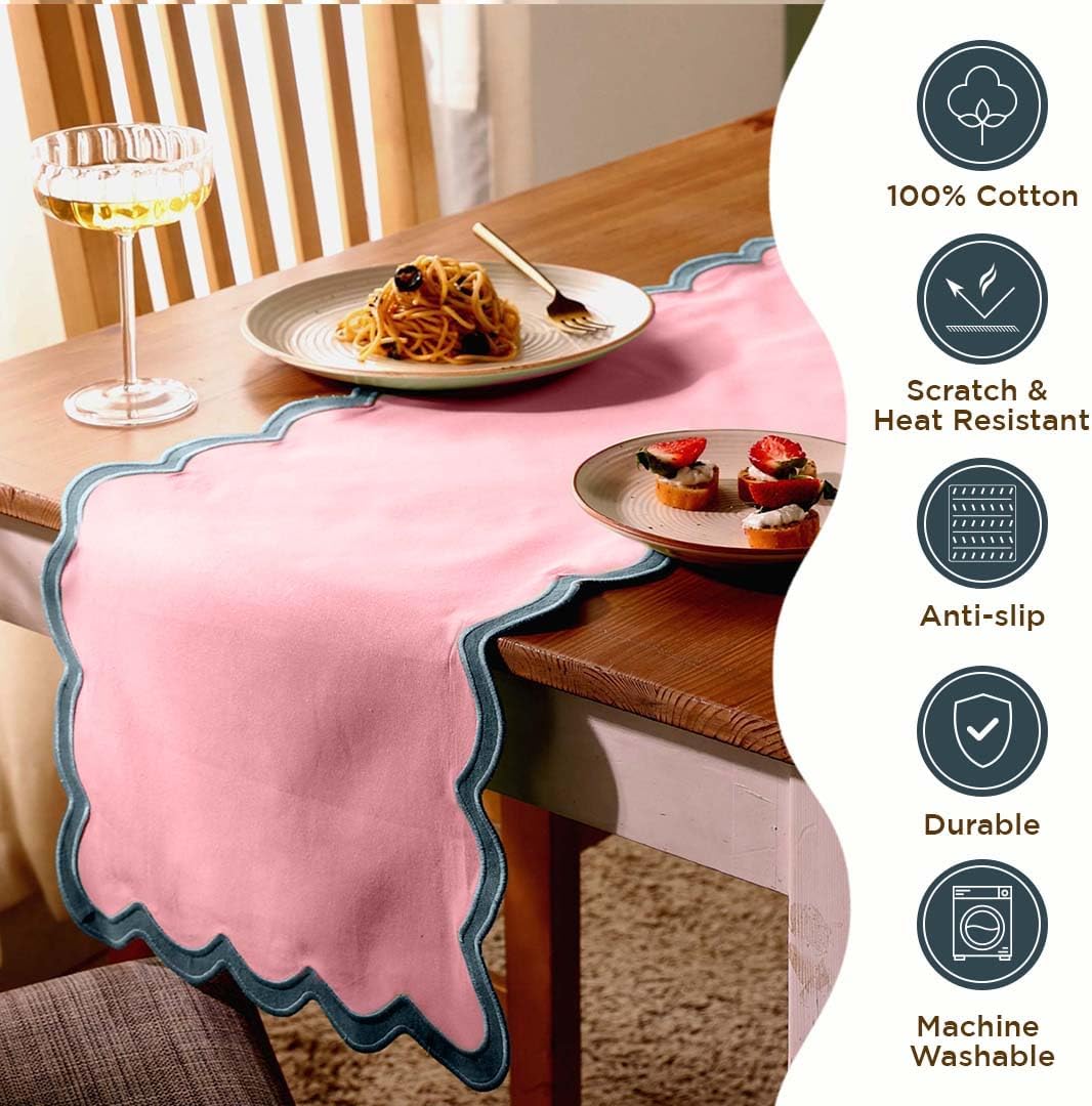 - MULTIFUNCTIONAL DECOR ELEMENT: These runner table party or pink runners for tables can even make for lovely coffee table runner and elevate your house dรฉcor quotient ten-folds. This extra long table runner is perfect for even side tables, dresser, round tables, square tables or a boho dresser.