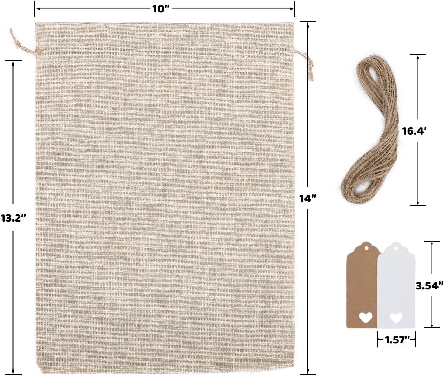 Tapleap Burlap Gift Bags with Drawstring - 10Pcs 10x14 Original Sacks with String and Tags for Wrapping Halloween Favors, Clothes, Toiletries, Breads, For Birthday, Wedding or Household Use
