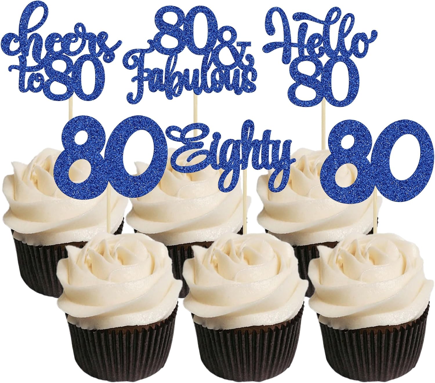 30Pcs Happy 80th Birthday Cupcake Toppers Eighty Cheers to 80 Years Old Birthday Cupcake Picks for Happy 80th Birthday Anniversary Party Cake Decorations Deep Blue Glitter