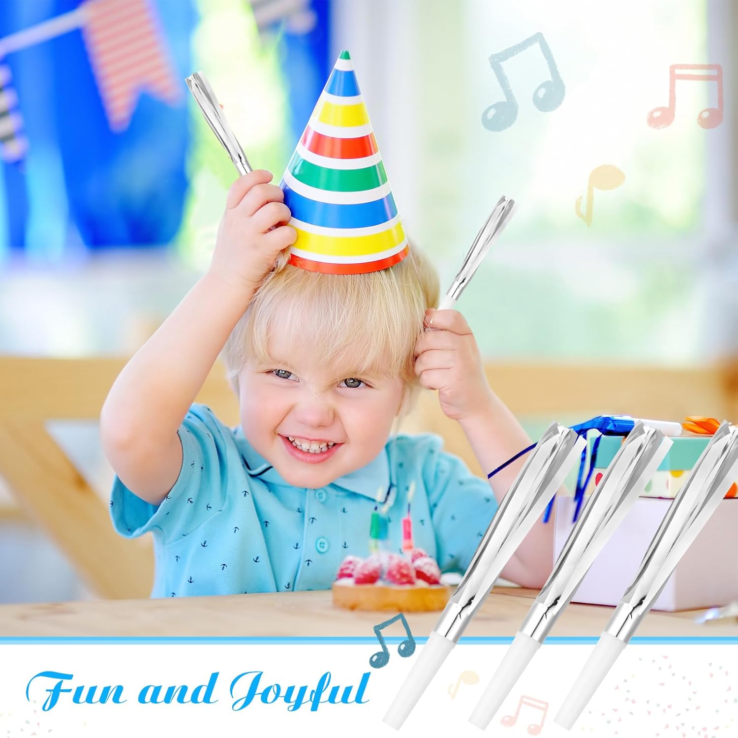 24 Pcs Silver Noise Makers Glitter Metallic Fringed Noise Makers Horns for Baby Shower, Kids Birthday, New Year Party Favor
