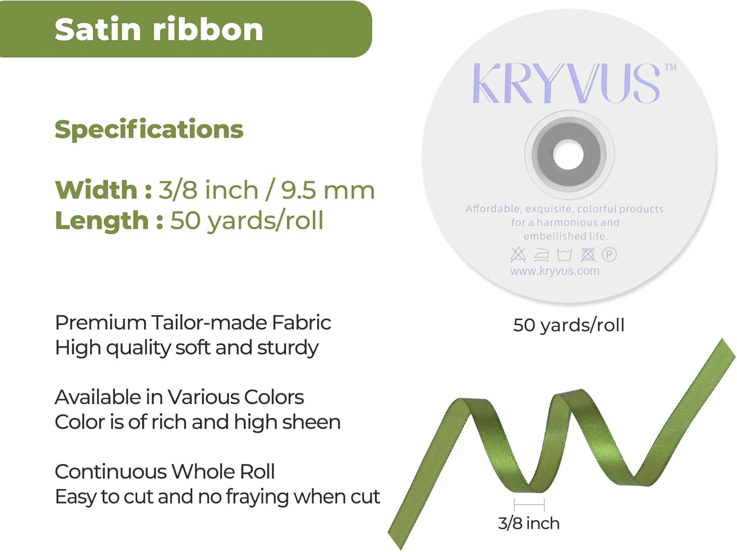 Olive Green Satin Ribbon 3/8 inch X Continuous 50 Yards, Single Face Polyester Ribbon Perfect for Gift Wrapping, Flower Bouquet, Wedding Decor, Crafts, Bow Making, Sewing and More