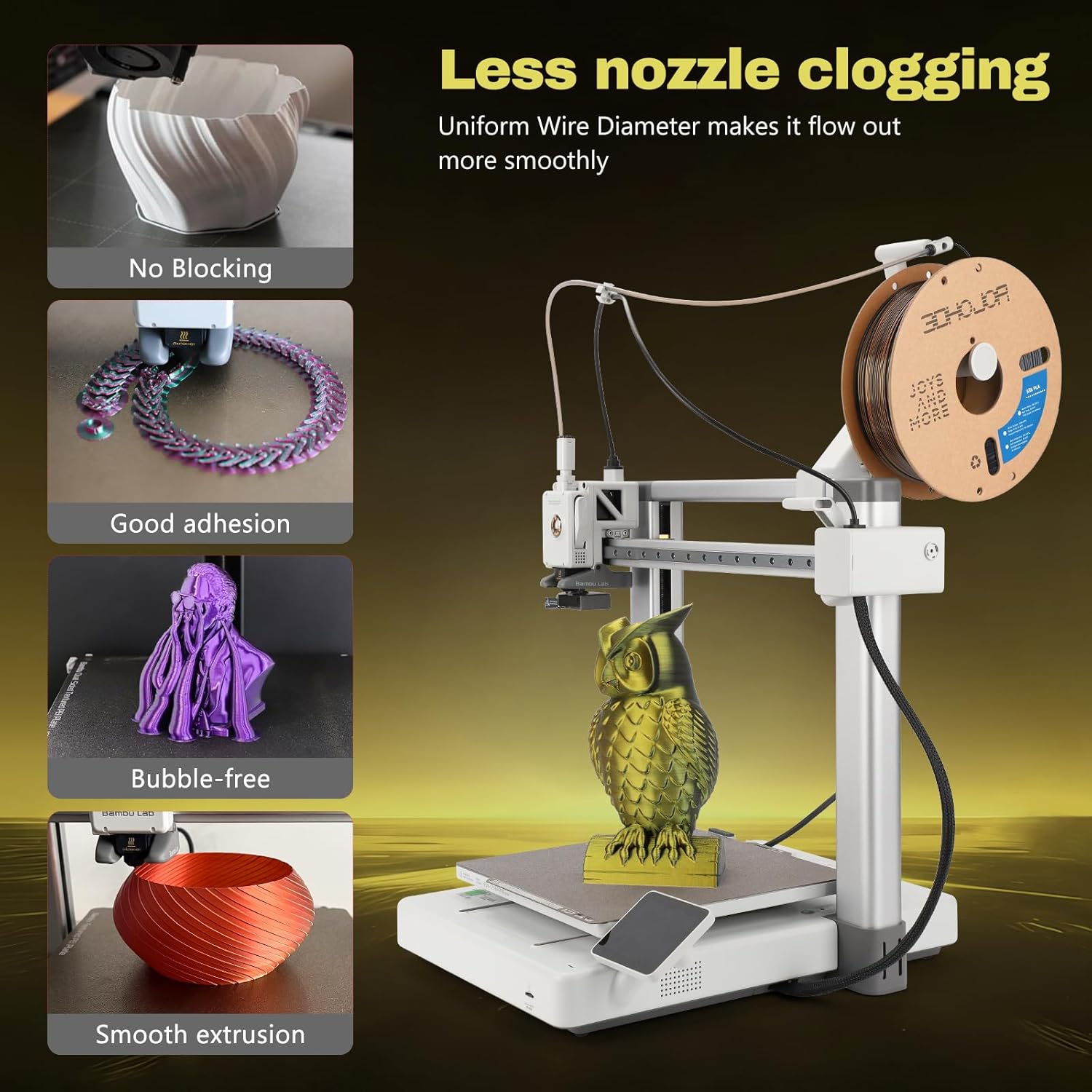 - 【Tangle-Free, Neatly Wound】: more resilient than traditional PLA, not easy to damage. Strict manual inspection ensures the neatness and easy feed of PLA filament winding. Vacuum-sealing guarantees moisture-free printing, eliminating clogs and bubbles, which increase your printing success rate.